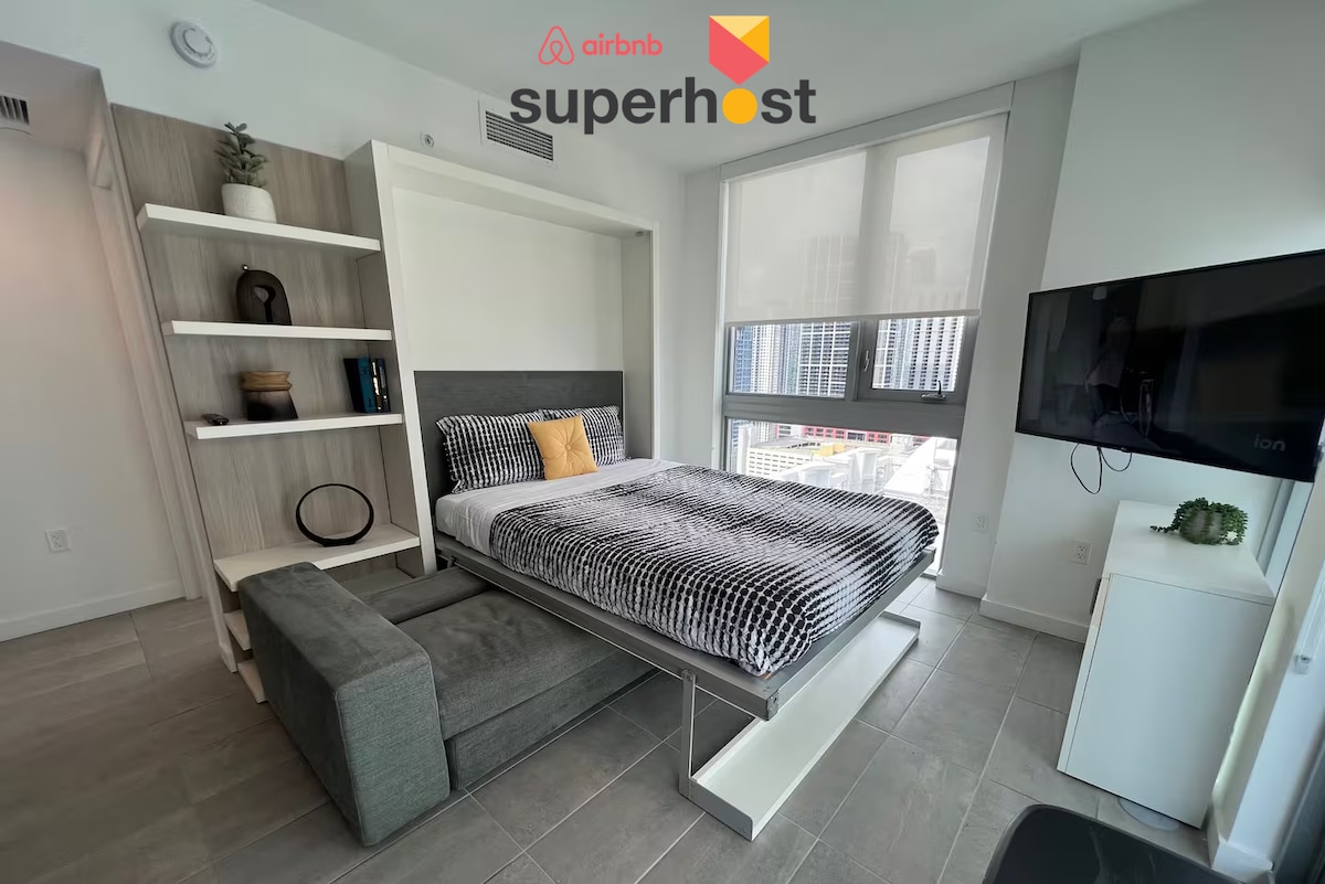 Modern Miami Studio with stunning views! Enjoy a cozy space with a King Size Bed, Smart TV, fast WiFi, and a private balcony. Perfect for relaxing after exploring the beach, nightlife, and top dining spots nearby. Located across the street from Bayside Marketplace Waterfront. Includes a kitchenette, central AC, and secure building access. Ideal for solo travelers or couples seeking comfort and style in the heart of Miami. Book your escape today 🌴