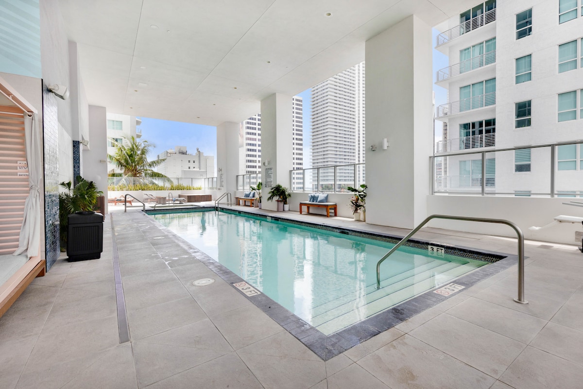 The Retreat in Miami! 🌴 This stylish apartment is just minutes from Freedom Tower and Kaseya Center 🏀 (home of the Miami Heat), offering stunning city views 🌆 and luxurious comfort. With easy access to Brickell, Wynwood 🎨, and the cruise ports 🚢, excitement is at your fingertips. Explore Bayside 🏝️, Frost Science Museum 🔬, and the Arsht Center 🎭. Unwind in a modern space designed for relaxation, featuring a rooftop pool and fitness center 💪—your perfect base for unique Miami experiences