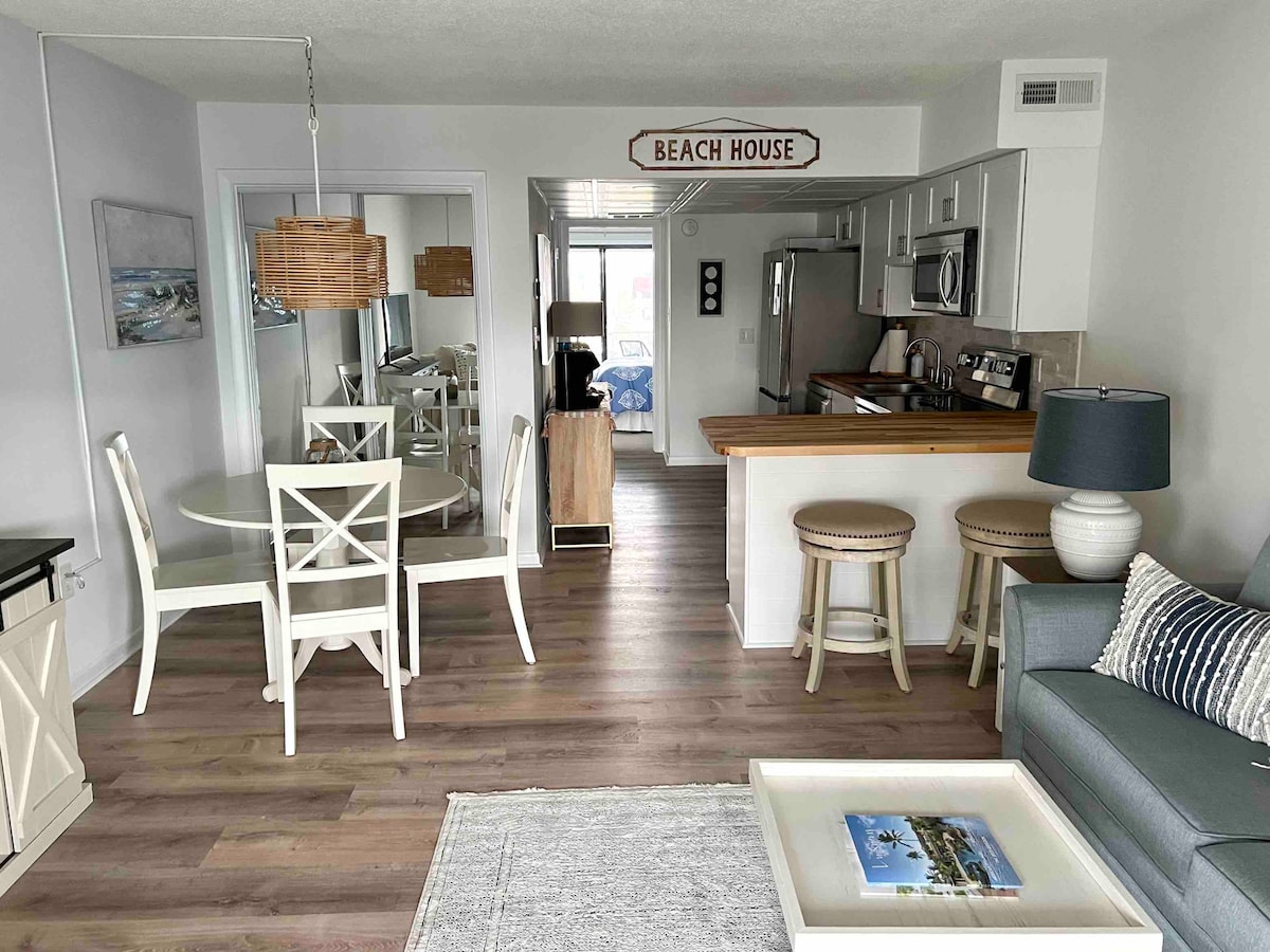 Note: Must be 25 or older to rent our home. Beautifully renovated 2 bedroom beach front condo with views of both the beach and bay. Enjoy watching the waves roll in or a stunning sunrise through floor to ceiling windows without ever getting out of your king size bed. In the evening, open your front door to witness breathtaking sunsets over the bay. Or just relax with a drink on the beachfront balcony and listen to the waves with a breathtaking view of the beach and ocean.