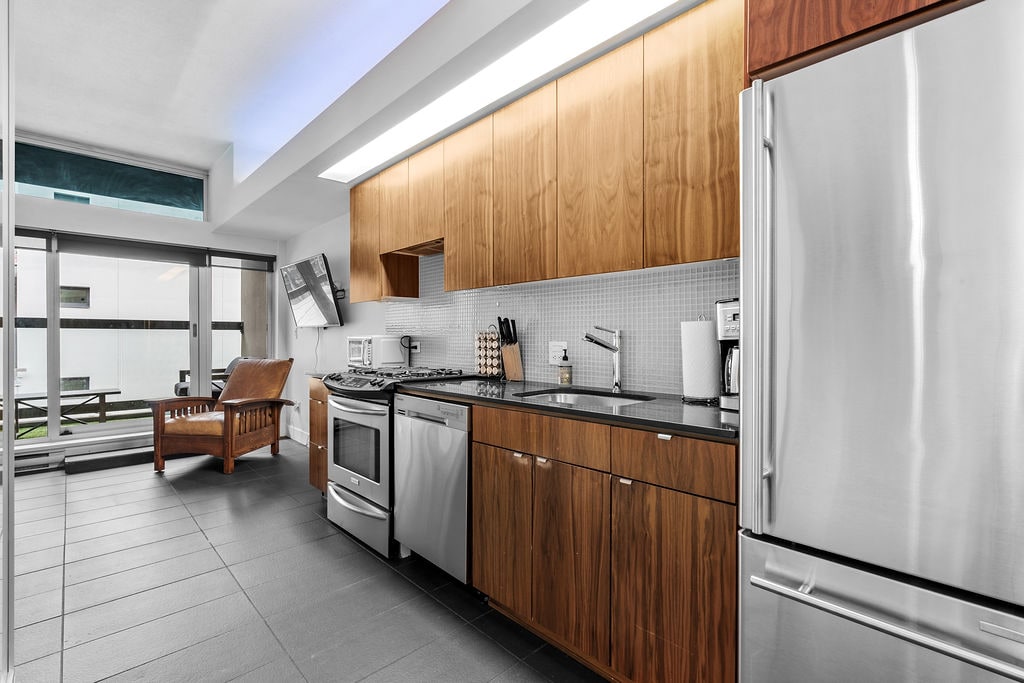 Enjoy a stylish pad in a convenient location. You'll be 8 blocks from Roger's Arena, 6 blocks from the Skytrain, 3 blocks from the Seawall, and steps away from the coolest underground bars, hip restaurants, progressive art galleries, music venues and night life in town. This is a great place for a foodie, creative, cyclist or urban explorer looking for a unique experience. Air Conditioning, Full Kitchen, Secure Parking, In Suite Laundry, Patio, Elevator, Dishwasher, TV, Sonos, Desk, Quiet.