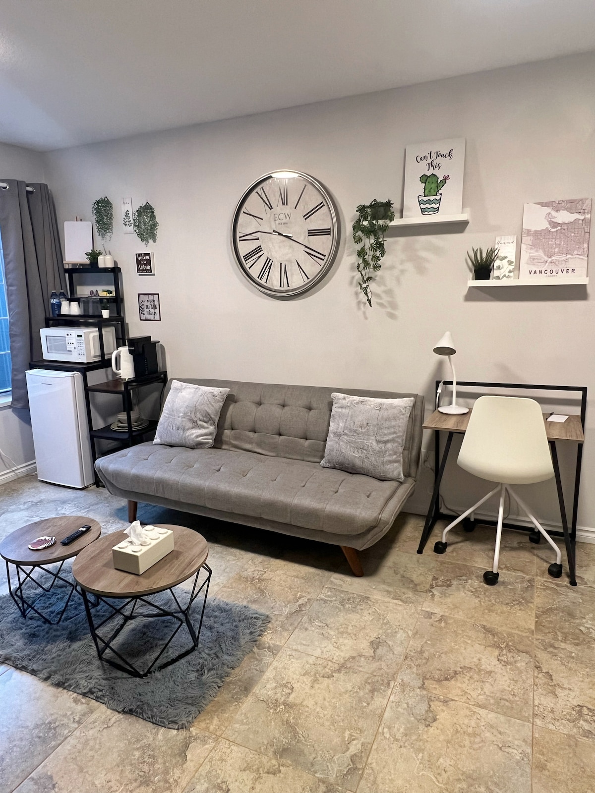 A bright basement bachelor suite in our duplex located in Mount Pleasant, walking distance to trendy Main St & Commercial Dr. The space is a private self-contained unit accessed via its own front door w/ keyless entry, equipped with a full kitchen, bathroom, full-sized washer & dryer, TV/wifi/keurig. The bed is accessed via a brand-new queen-sized Murphy bed system from California Closets, which folds up to become a dedicated work space. Also included is a sofa bed. Free street parking available