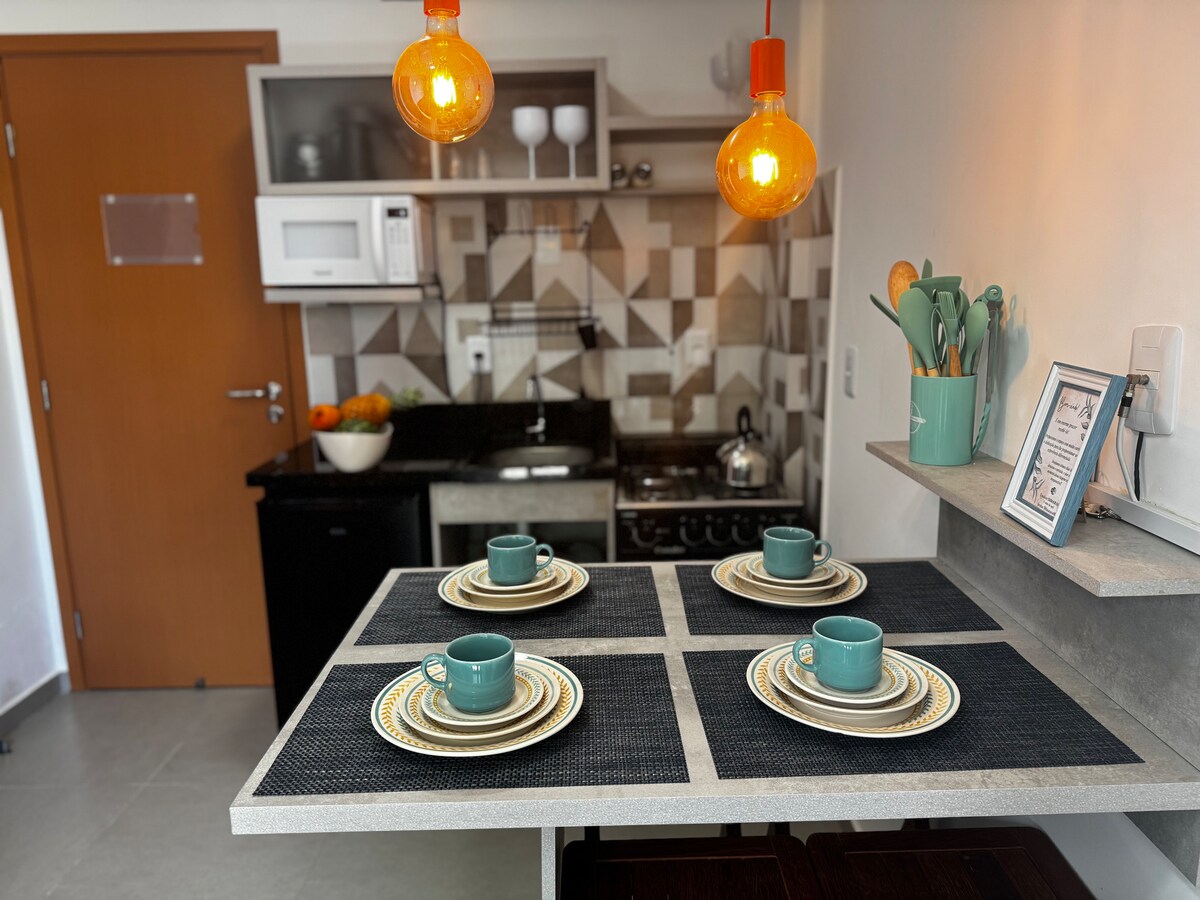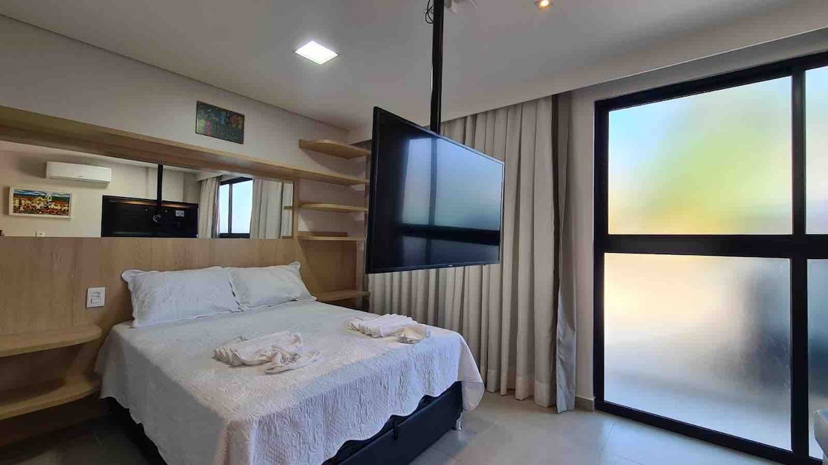 Flat aconchegante, com cozinha americana, sala com sofá-cama, ar, smartTV, varanda e um quarto com cama de casal, ar e armário Cozinha com todos utensílios, micro-ondas, liquidificador, sanduicheira, frigoba, cafeteira louças e airfryer Enxoval Chuveiro com aquecimento a gás Wi-Fi Área de lazer no Rooftop com espelho d'agua, vista para o mar, piscina adulto e infantil no lado do por do sol O Maraca Beach II fica a 50 metros da praia, com elevador, portaria 24hs e acesso também pela Beira Mar