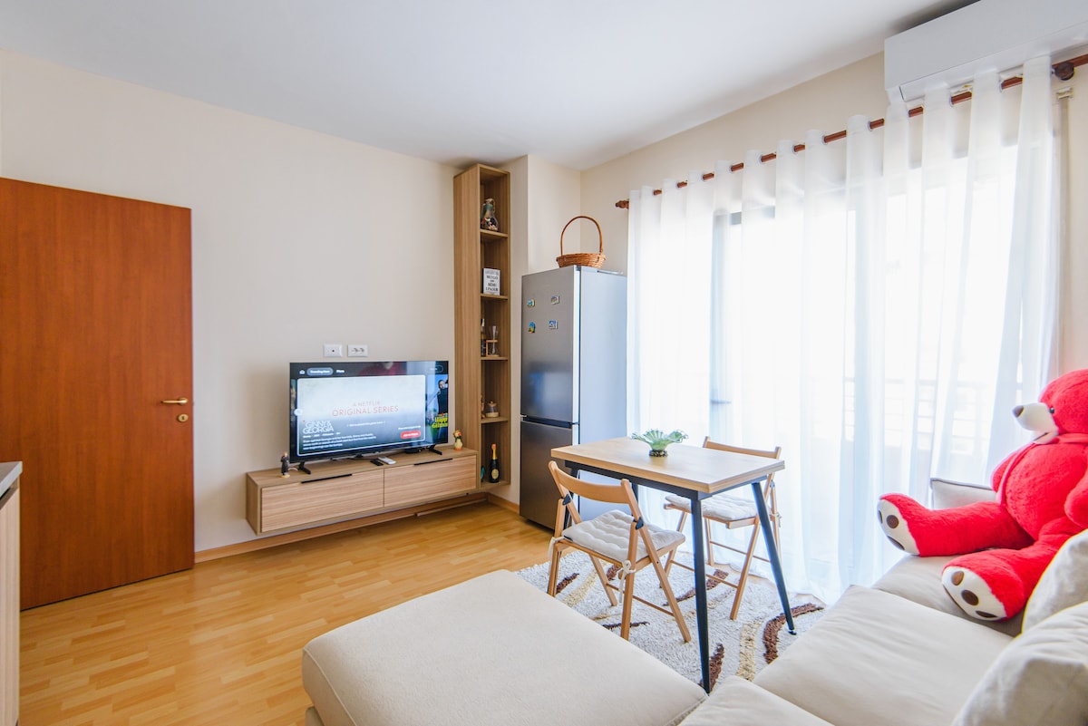 You'll have a great time at this comfortable place to stay: -If you are travelling alone, or with your partner or with your family, -If you are home office or on holidays, -if you want to stay short or long term, this place is just right for you! Flat is fully equipped for your staying! There is a very comfy bed in the bedroom and a sofa bed in the living room. There is AC for both heating and cooling. There is kitchen with lots of appliances even for long term stay. Just come :)