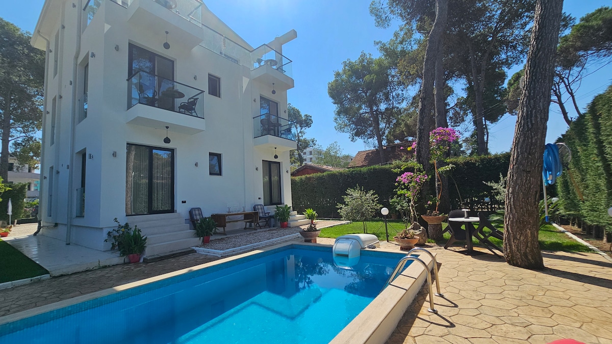 Welcome to our serene seaside villa in Golem Beach — a hidden gem just 300 meters from the coastline. This spacious 600m² property built in 2025 is uniquely designed with three private 2-bedroom apartments, each occupying a separate floor, perfect for families, couples, or groups who want privacy while staying close together. Each apartment features a cosy living room, private bathroom, and balcony, while guests share access to a beautiful private pool, large garden, and private parking.