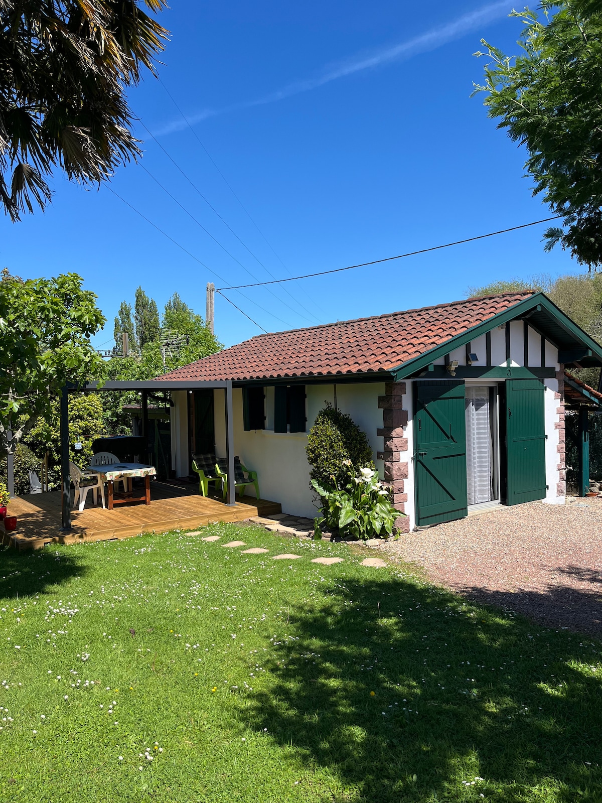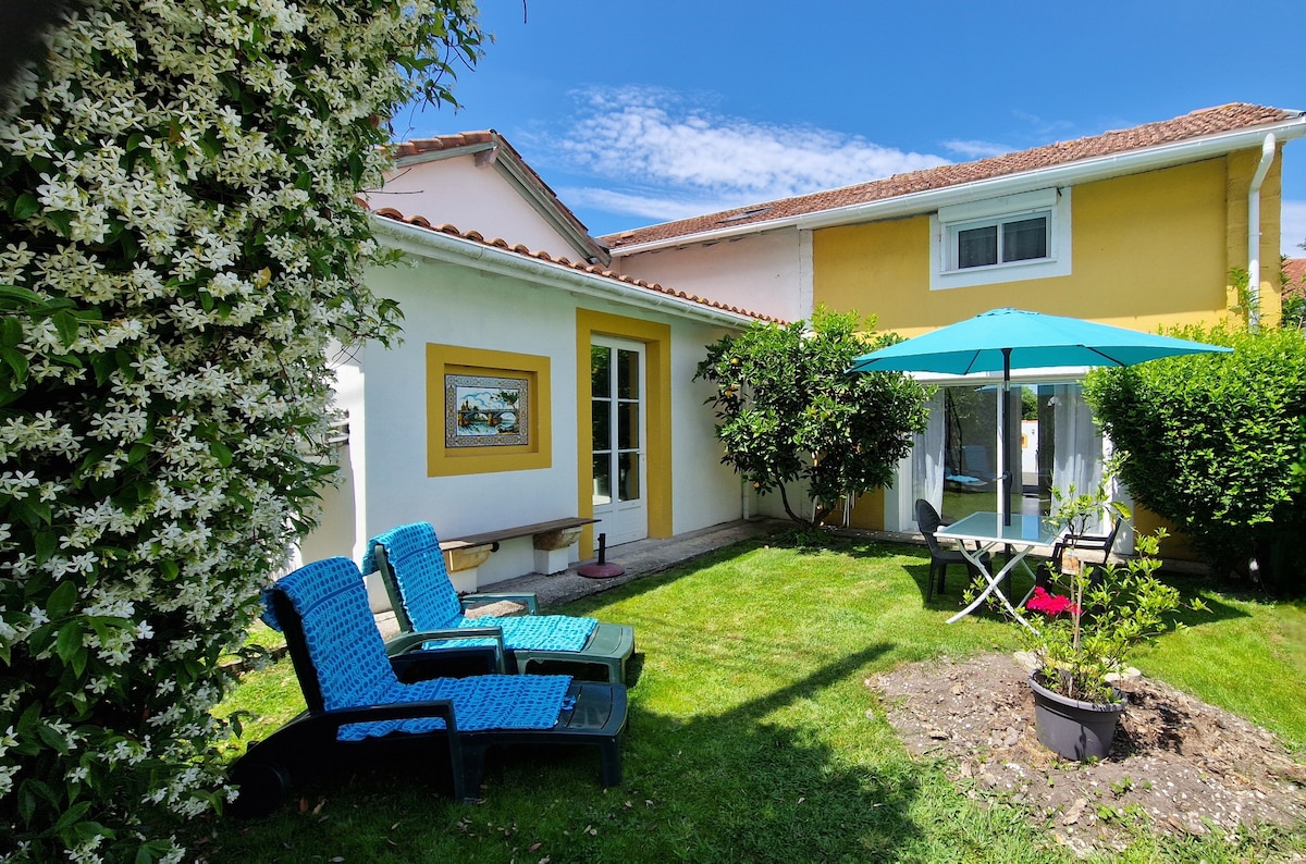 Note logement, entierement refait à neuf ,dispose d un jardin privatif de 150 m2, d' une terrasse ensoleillée et d une place de parking gratuit. Une chambre est au rez-de-chaussée avec 2 lits simples et une a l étage avec 1 lit double. Nous sommes situés à 3 km de la plage et de Bayonne et proches des commerces dans un quartier calme. Le logement est entièrement équipé (WiFi et climatisation) Idéal pour passer des vacances en famille !!