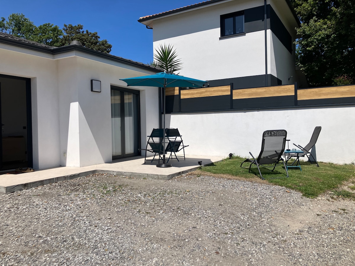 2 bedroom new house of 40m2 under pine trees with a private garden. 800m from the beach and close to cycle paths through the forest that bring you north to Capbreton or south to Ondres. Access by a shared path. 2 bedrooms that can each be left with king size beds or split into 4 singles. Functional Living room/kitchen with all amenities and and a gas griddle for outside cooking. Eat dinner outside on the Patio and then take the aperitif on the sofa under the trees.