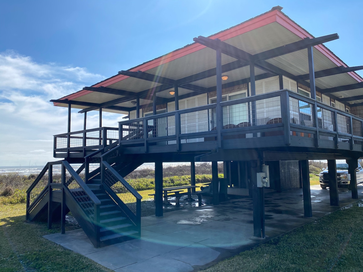 Join us beach front! Reminiscent of a Polynesian flying saucer, the one of a kind "Barataria" possesses the perfect basics for enjoying your Galveston beachfront vacations with a wide, uninterrupted view. A sheltered, open deck flows out of the contemporary and comfortable living/kitchen area. Three bedroom, two baths, just right, nothing more.
