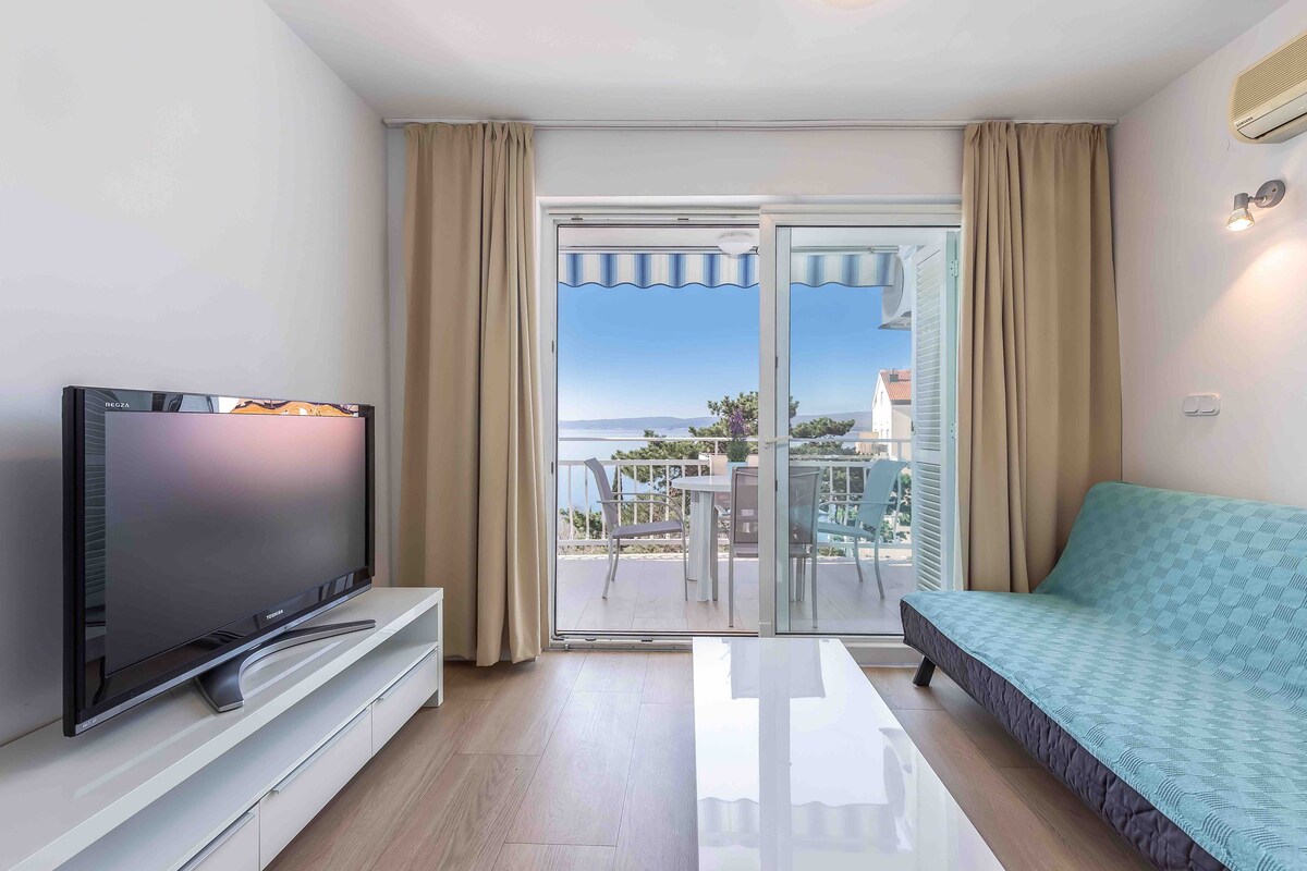 Apartment is located 50 m from the sea and pebble beach. It has one room with double and bunk bed, bathroom, kitchen + living room and terrace with amazing sea view. It's completely new and fully equipped (dish washer, laundry machine, air conditioning, WIFI). Parking is just behind the building. There is hotel next to the apartment where breakfast/lunch/dinner can be taken as well as sea water indoor pool (both food and pool for reasonable price).