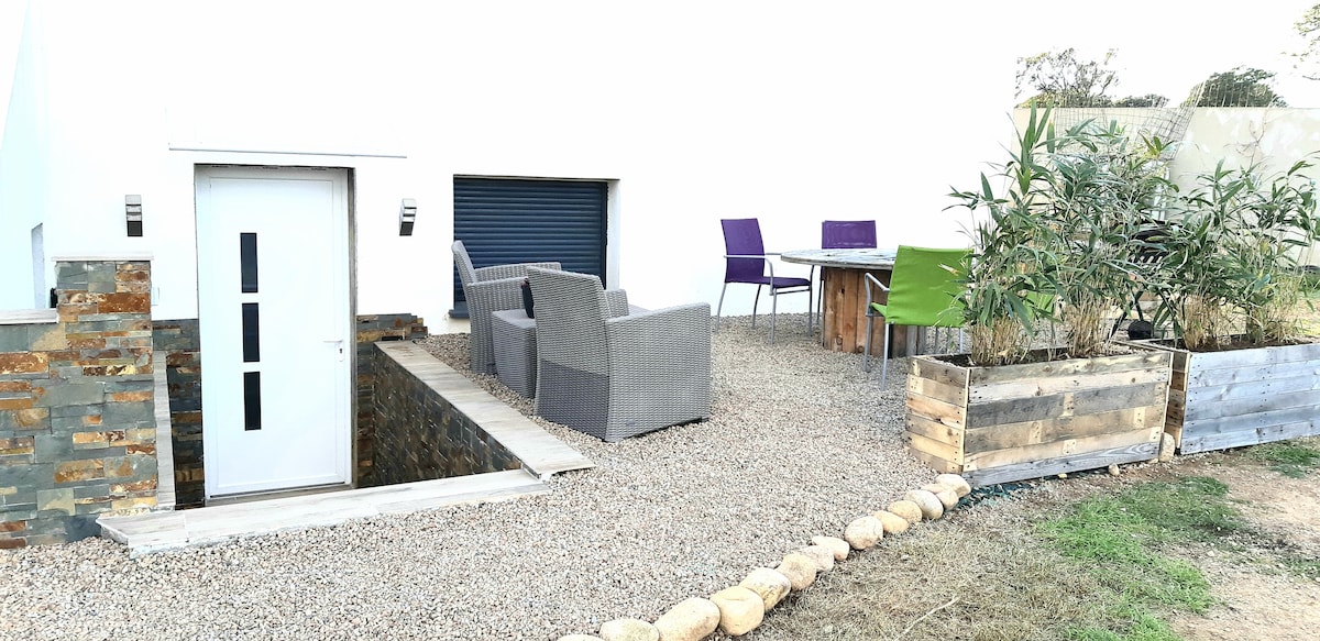 Studio de 30 m2 en rez-de-jardin de notre maison avec entrée indépendante et de plain pied. La pièce à vivre , disposant d'une cuisine aménagée et d'un coin nuit (lit queen size) donne sur le jardin non clôturé de 1500m2. La salle d'eau (wc et douche à l'italienne) comporte machine à laver et penderie. Le linge de maison (drap, housse de couette, taies d'oreiller, serviettes de toilette et torchons ) est fourni gratuitement. Vous pouvez garer votre véhicule près de l'entrée du studio.