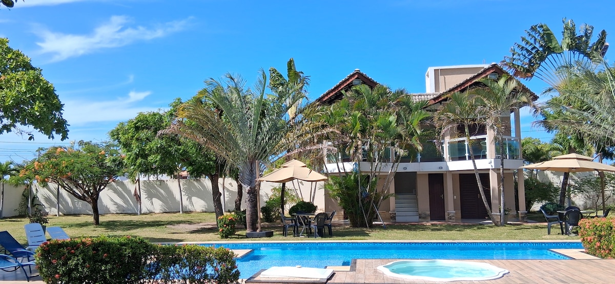 A Casa Alegria Uruaú é um refúgio p você e sua família viverem dias leves e alegres. Todo sossego e tranquilidade numa área de 1200 m², c piscina adulto e infantil, churrasq. balanço, redário. São 3 quartos (1 suíte com ar condic.), cama casal, cama solteiro e armadores p rede. Cozinha completa, sala e varanda grande c armadores p rede. 3 banheiros. WI-FI, roupas de cama e banho, gás. Boa vizinhança. Próx às praias e lagoas, como Praia do Uruaú, Barra da Sucatinga, Lagoa do Uruaú. 14 pessoas