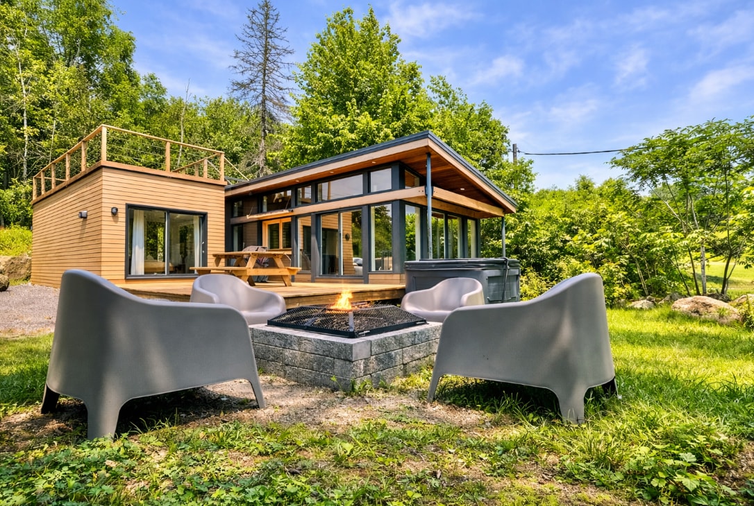 Chalet en pleine nature avec vue sur la montagne. Spa extérieur couvert ouvert à l’année, foyers au bois intérieur et extérieur, planchers chauffants et BBQ. Cuisine complète avec café inclus. Trois chambres : suite des maîtres avec lit king et foyer au gaz, 2e chambre avec lit queen et mezzanine avec lit queen. Terrain de 5 acres avec 2e phase locative prévue en 2026. Parfait pour vous ressourcer. No enr. 309551 exp. 2026-06-08.