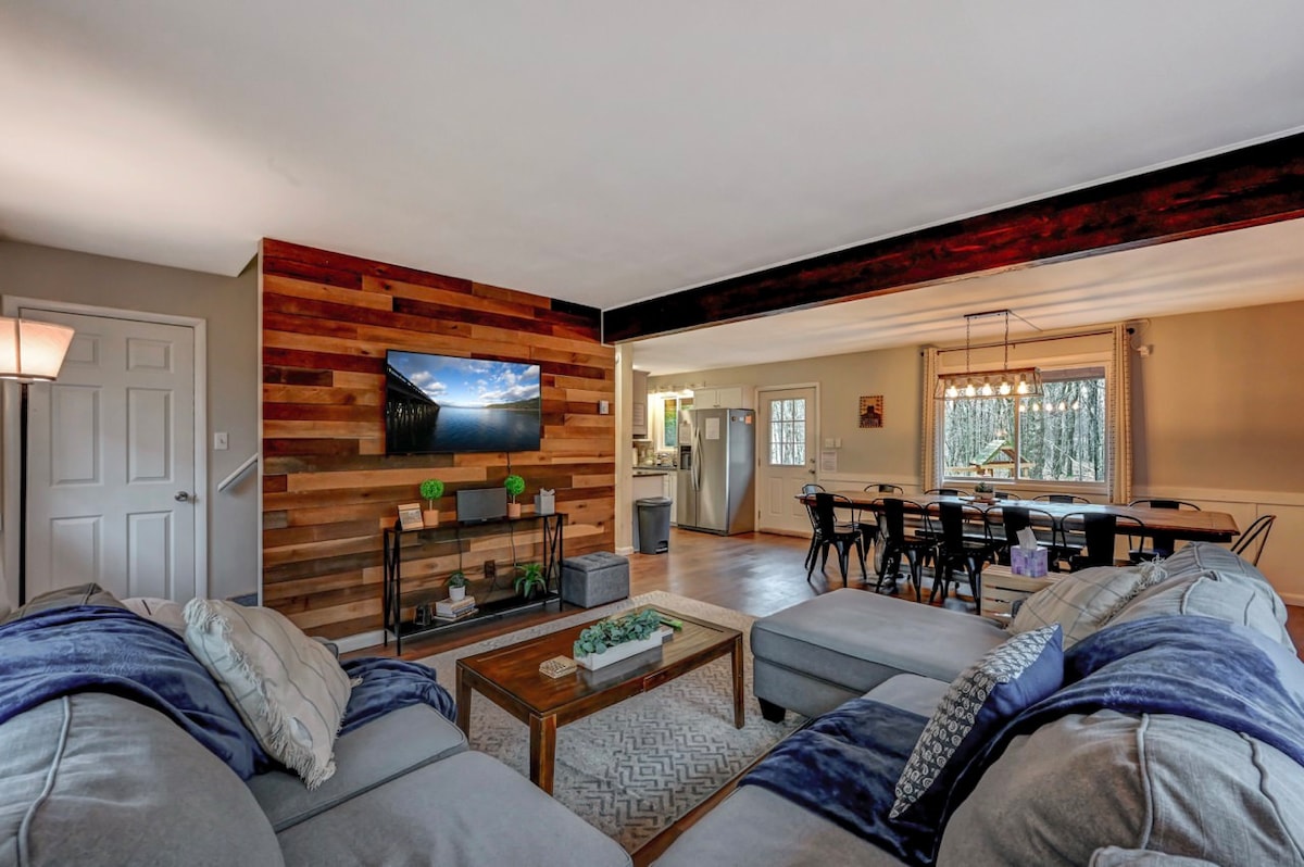 This family friendly ranch home is in Bear Creek Lakes Community in Jim Thorpe. Only 10 min drive to historic Jim Thorpe Train. We are walking distance to the lake, pool, playgrounds, tennis & basketball courts! The living room has an 82" TV and double sided gas fireplace open to the dining room. The garage has arcade style games, a pool table, foosball, mini ping pong and shuffleboard. The backyard has a deck, BBQ, fire pit and many outdoor games. We have kayaks, paddleboards and bikes.