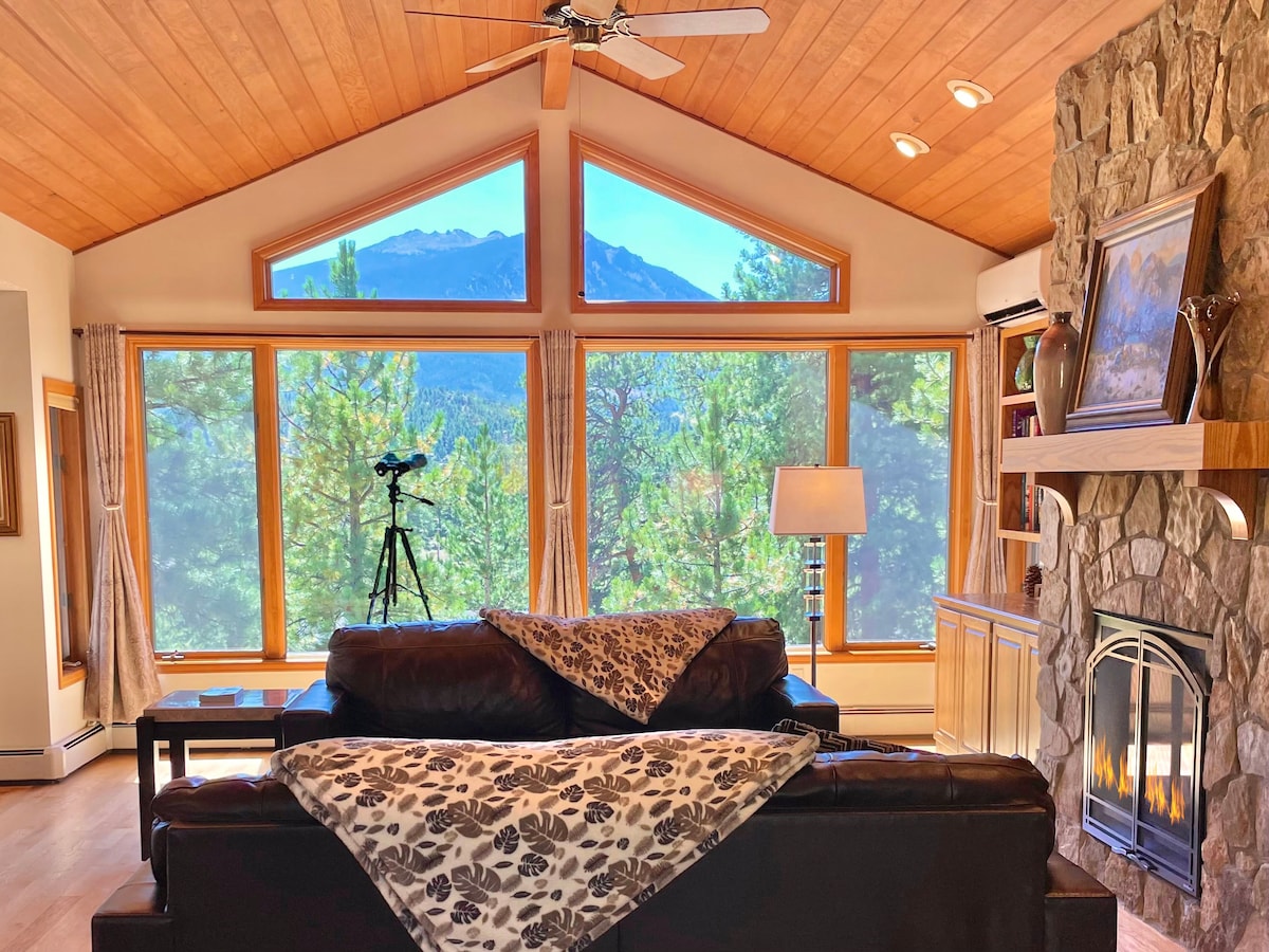 Enjoy Estes' best views from our riverfront home minutes from Rocky Mountain National Park (20-NCD0196). Wake to alpenglow on Deer Mountain, watch the sun set behind the Continental Divide, and fall asleep to the sound of rushing water. “Outstanding! By far our best airbnb stay ever!” - James - Huge deck - King beds - Private fishing access - Lots of space w/ fireplace, games & media room - 2 mins to National Park; 5 mins to town Perfect retreat for 8 -- plus the wildlife you'll see daily!