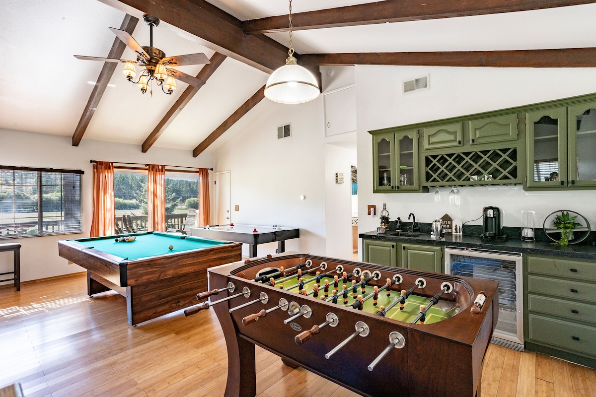 No detail’s been overlooked at our luxurious mountain retreat on 1/2 acre in Moonridge. Sleeps 8. Soak in the jacuzzi, enjoy coffee or cocktails on the porch swing, sit around the fire table or outdoor dining set, BBQ or make pancakes on our huge grill. Use the Peloton or private sauna. Play pool, foosball, ping pong, darts or our arcade game! Chill on our reclining sofa; watch movies or the game. Lake, slopes, shops & restaurants nearby but you may not want to leave the house!
