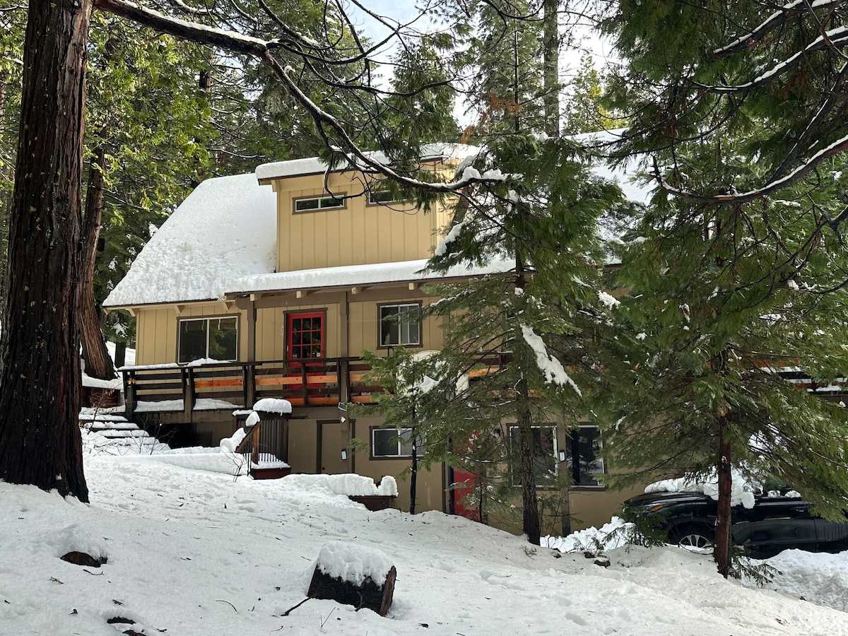 Escape to The Chalet Getaway - a 1970s cabin that waits to wrap you in warm vintage vibes. The 20 foot bow front windows provide great views of the surrounding blue skies and beautiful trees. The large deck is a front row seat to the bountiful sights and sounds of nature, and is perfect for stargazing from the hot tub. Connect with loved ones in this cozy, nostalgic setting. 10 minutes to stunning Pinecrest Lake, 15 to Dodge Ridge. Surrounded by loads of fun outdoor activities.