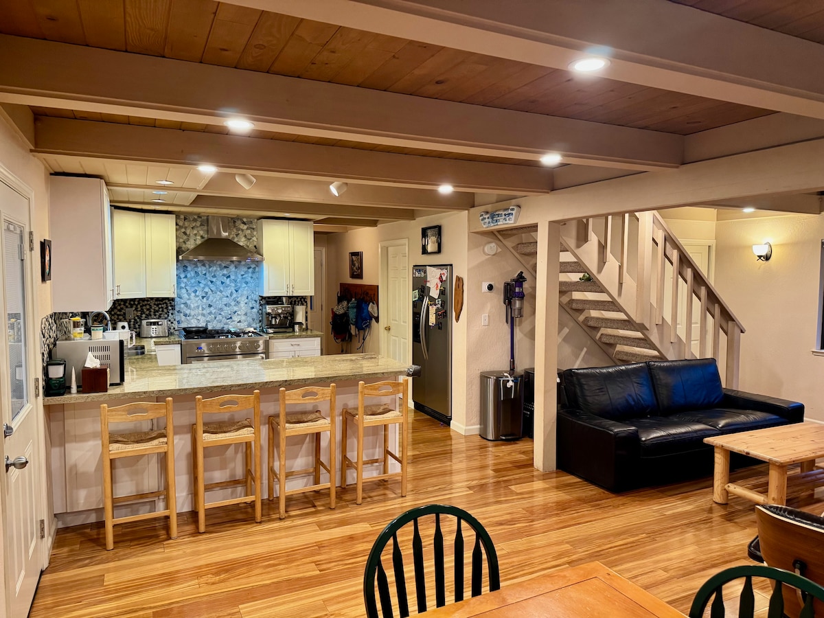 This newly renovated 1800 sq. ft. family friendly house has three bedrooms, two bathrooms, and a back deck that overlooks a creek to lounge, enjoy local wine or BBQ. You’ll fall in love with the soulful sounds of the year round creek splashing through this miniature grove of Sequoias. This perfect getaway for food, wine, and beer lovers is less than a mile (.7) from downtown Murphys. For outdoor adventurers, New Melones Lake, Bear Valley, and Big Trees Village are a short drive away.