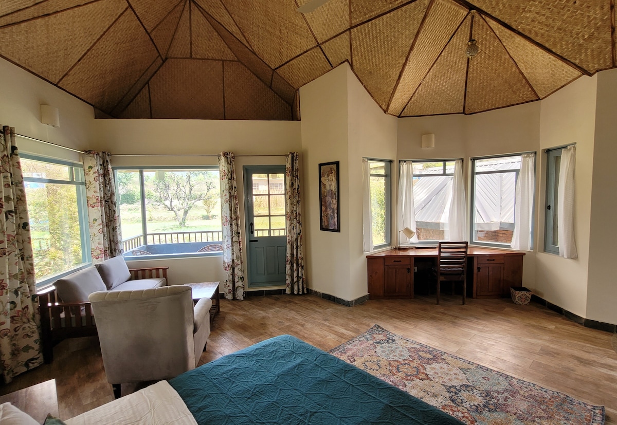 The cottage is near to Manali facing misty mountainous landscape. The interiors are elegantly done, with a living room that is pre-dominantly wood-panelled and furnished with comfy upholstered sofas covered in crotchet cloth, a glass-topped coffe. mealtimes convenient. A television is also provided for entertainment and leisure. The room on offer is furnished with a comfy double bed tucked in warm duvets, a mirrored wardrobe, and a dresser for dressing convenience.