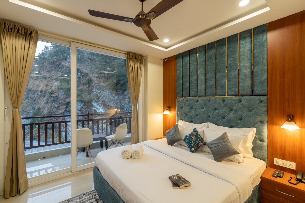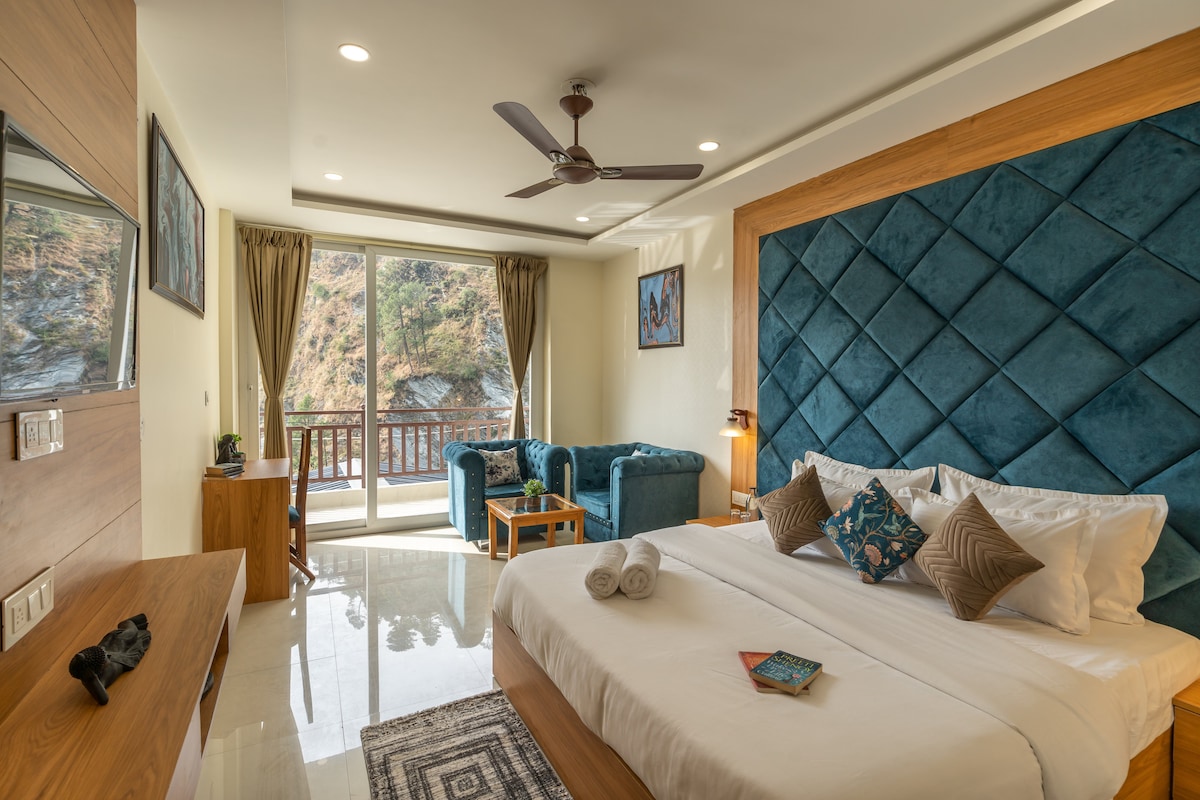 No detail is overlooked at this charming and upscale place to stay. It is a Deluxe room with all the amenities and an ensuite bathroom and a river facing balcony. The property has a swimming pool and a cafeteria