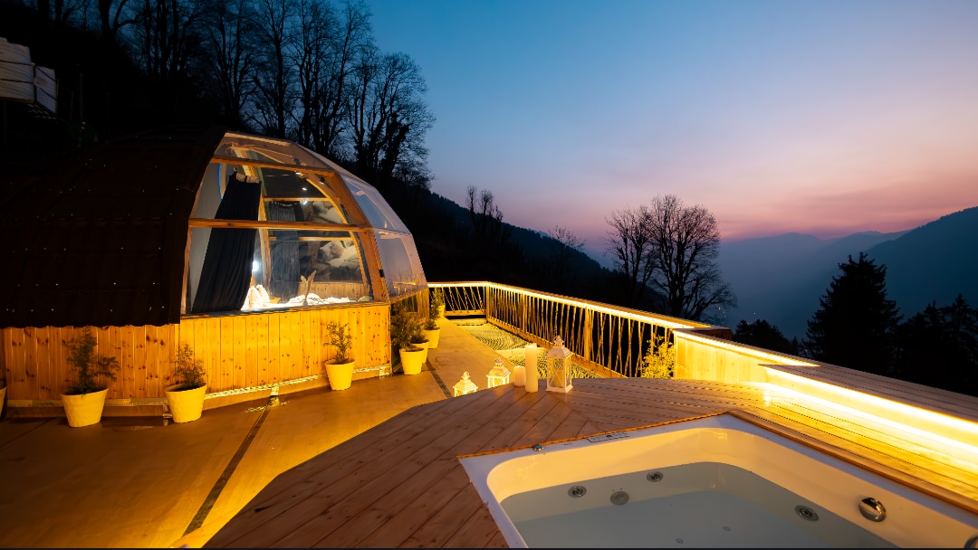 HALTINN H201 – A Mountain Glass Igloo DOME in MANALI Nestled in the serene hills of MANALI, just 11 km from Mall Road , H201 offers breathtaking mountain views, cozy interiors, and a private OPEN bathtub to unwind with your loved ones. Spend magical evenings by the firepit, overlooking the valley as the sun sets and rises over the peaks. Perfect for couples or families looking for a peaceful and memorable getaway. You won’t forget your time in this romantic, memorable place.