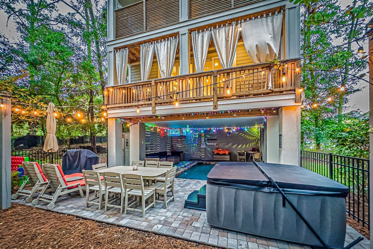 Welcome to your Lowcountry retreat! This family-friendly home comfortably sleeps up to 9 adults, offering a perfect blend of relaxation and entertainment for all => Hot Tub => Fire pit => Movie Screen => Yard Games => Pet friendly* => 4 bikes, 2 scooters => 2 Paddle boards => Luxe outdoor living => Walk to old town => 3 bd, 2.5 bath => 2 king, queen over queen, 1 Twin => Great for families => Palmetto Bluff luxury w/o the price => Screened in pergola (pics soon) => 5 star bedding high end linens
