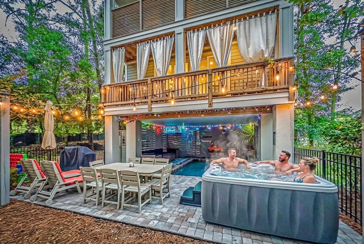 Welcome to your Lowcountry retreat! This family-friendly home comfortably sleeps up to 9 adults, offering a perfect blend of relaxation and entertainment for all => Hot Tub => Fire pit => Movie Screen => Yard Games => Pet friendly* => 4 bikes, 2 scooters => 2 Paddle boards => Luxe outdoor living => Walk to old town => 3 bd, 2.5 bath => 2 king, queen over queen, 1 Twin => Great for families => Palmetto Bluff luxury w/o the price => Screened in pergola (pics soon) => 5 star bedding high end linens
