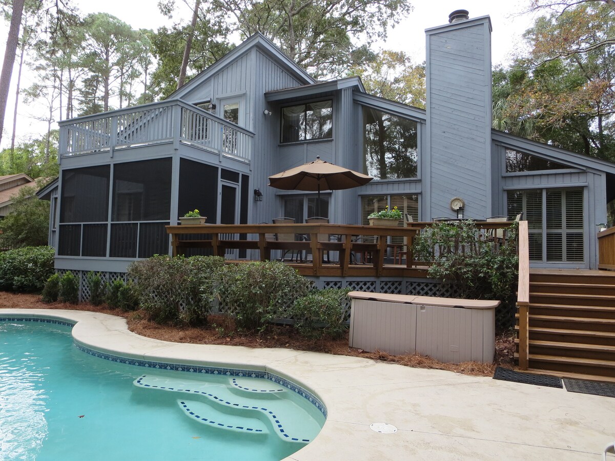 This clean, comfortable 2100 sqft, unique 2 bedroom Lowcountry home is on the New River surrounded by 1000’s of acres of old rice fields, marshlands and wildlife. It is well appointed with vaulted ceilings and windows galore to capture the view of the water and sunsets. There are 6 decks to sit, sun, grill, dine or swim. Comfy beds, spacious rooms, large LR and well equipped kitchen. We are 12 miles to Savannah, 7 to Bluffton, 15 to Hilton Head. There’s an i-waveV air purifier in the A/C