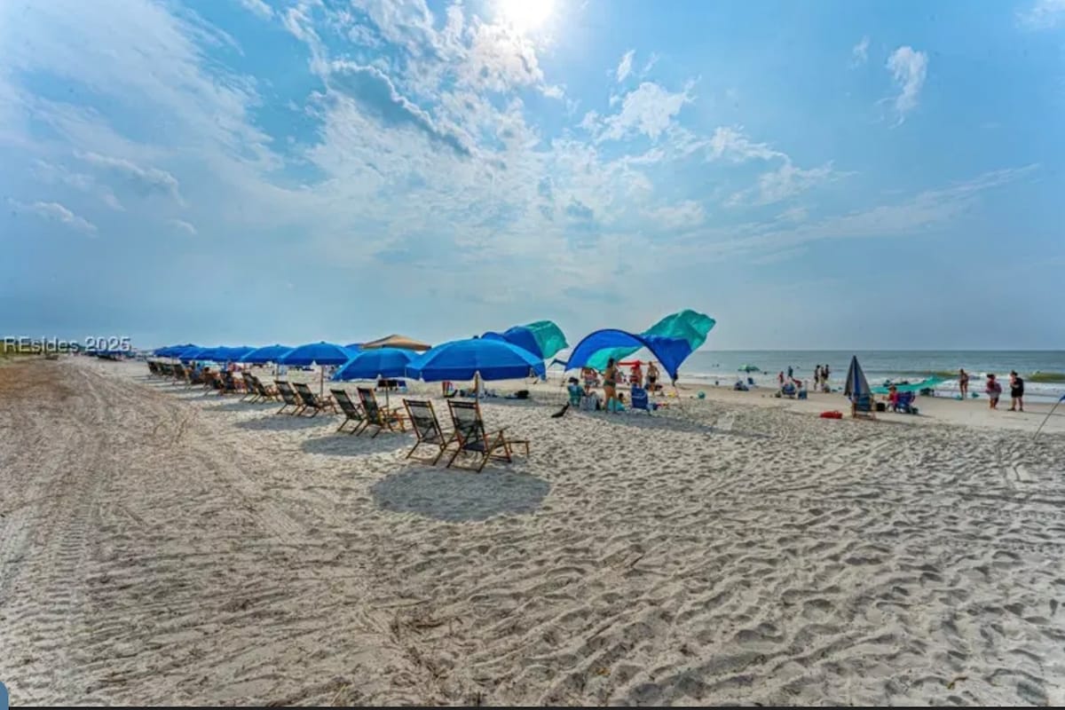 Stay in a unique, quiet beachfront neighborhood for your vacation on HHI. Enjoy a 5 minute/2 block WALK TO THE BEACH, 2 FREE bikes, Roku with NETFLIX, and a mid-island location for easy access to local attractions. Step inside to a bright, super clean, well stocked place with all of the comforts of home. Outside, you are surrounded by Live Oaks and natural landscaping. The apt. features LR/kitchen combo, 1 bedroom w/ a queen bed, full bath, W/D in walk-in closet, and a deck w/ seating.