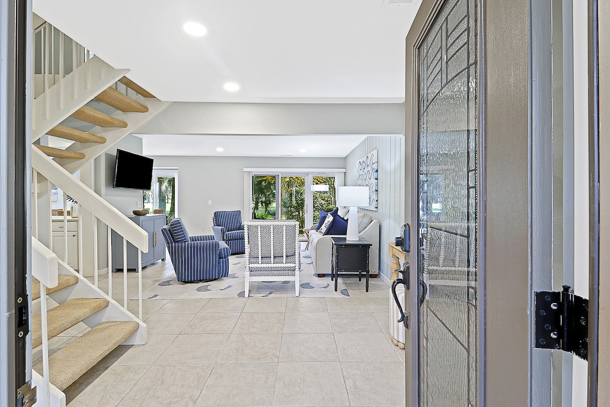 ✨Top 5% Guest Favorite✨ Gated Beachfront Resort: Golf, Tennis, Pickleball, Pool, Restaurants & Bars! Gorgeous Sunny Villa w/Panoramic Lagoon & Golf View! Beautiful & Lush Scenery: Huge Old Oaks, dripping in Spanish Moss ●Stylish Coastal Décor ●Sunny 1st Floor ●KING BED Master ●3 XL SmartTVs ●FREE WIFI ●Fully Stocked Kitchen ●Walk-in Shower ●Washer/Dryer ●Beach Chairs, Boogie Boards & More! ● BBQ ●Keyless ●Gorgeous Walk & Bike Paths ●Close to Coligny! ●Walk to Shipyard Golf Club & Pub!!