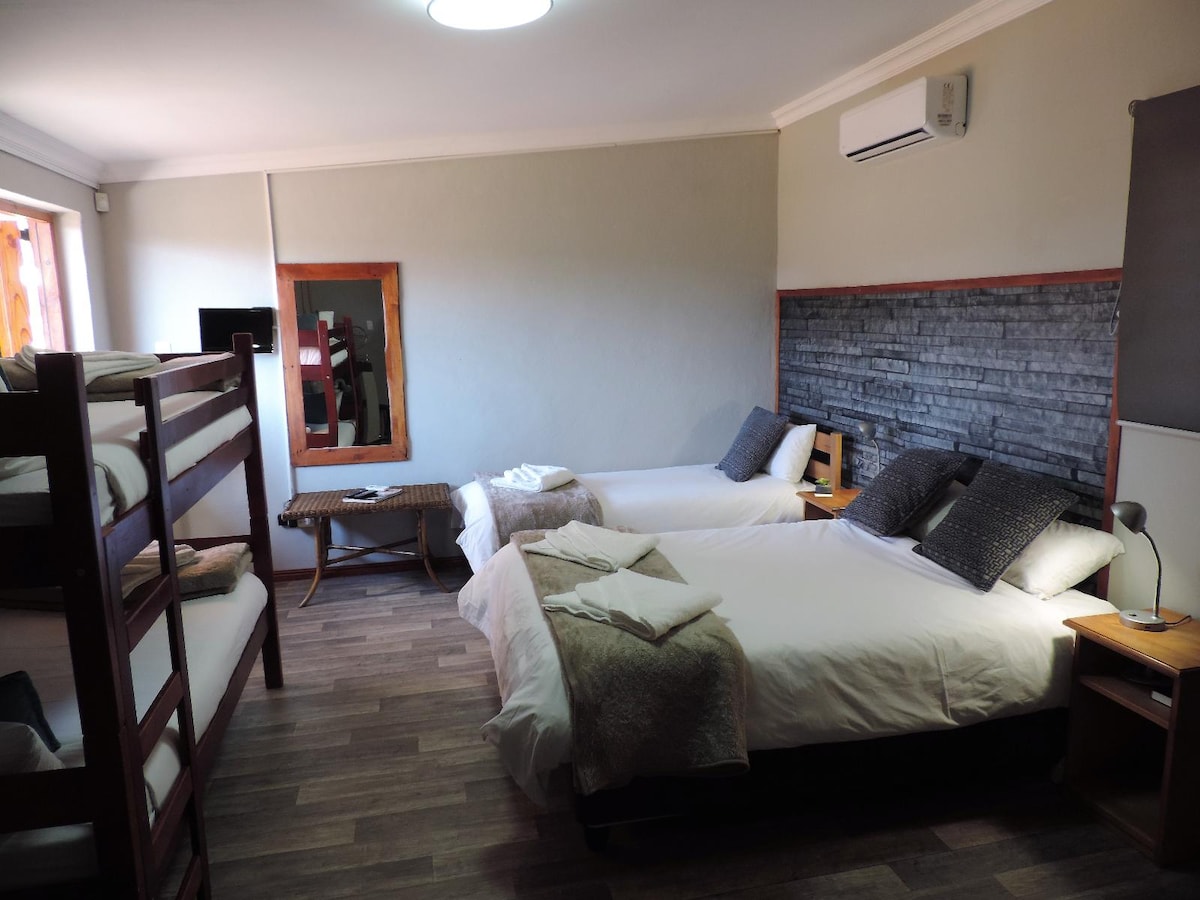Private on suite rooms facing outside patio with picnic bunks. Communal braai area with Karoo campfire atmosphere. Situated in quiet area on the outskirts of town. 400m from popular restaurants like spur and wimpy and several service stations.