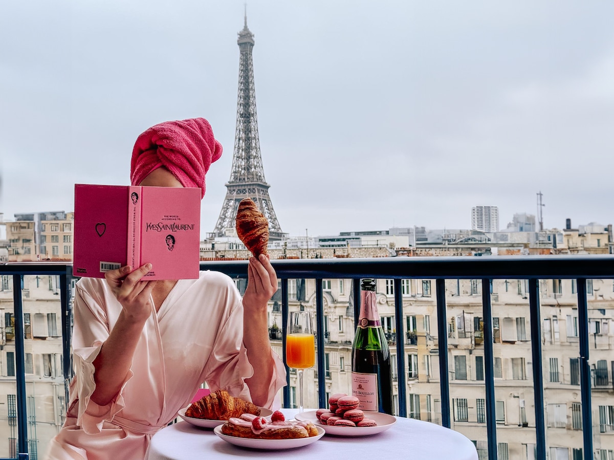 ✨ Top 3 Guest Highlights · Unforgettable Eiffel Tower views from your balcony · Parisian neighborhood with cafés, markets & metro nearby · Attentive hosting – responsive and caring throughout your stay ✨ Your Parisian Dream Stay Awaits From sunrise over the rooftops to the magical sparkle of the Eiffel Tower at night, this studio places you at the heart of Paris. Start your day with croissants on the balcony, explore the city with ease, then return to a cozy retreat with the sparkling Tower.