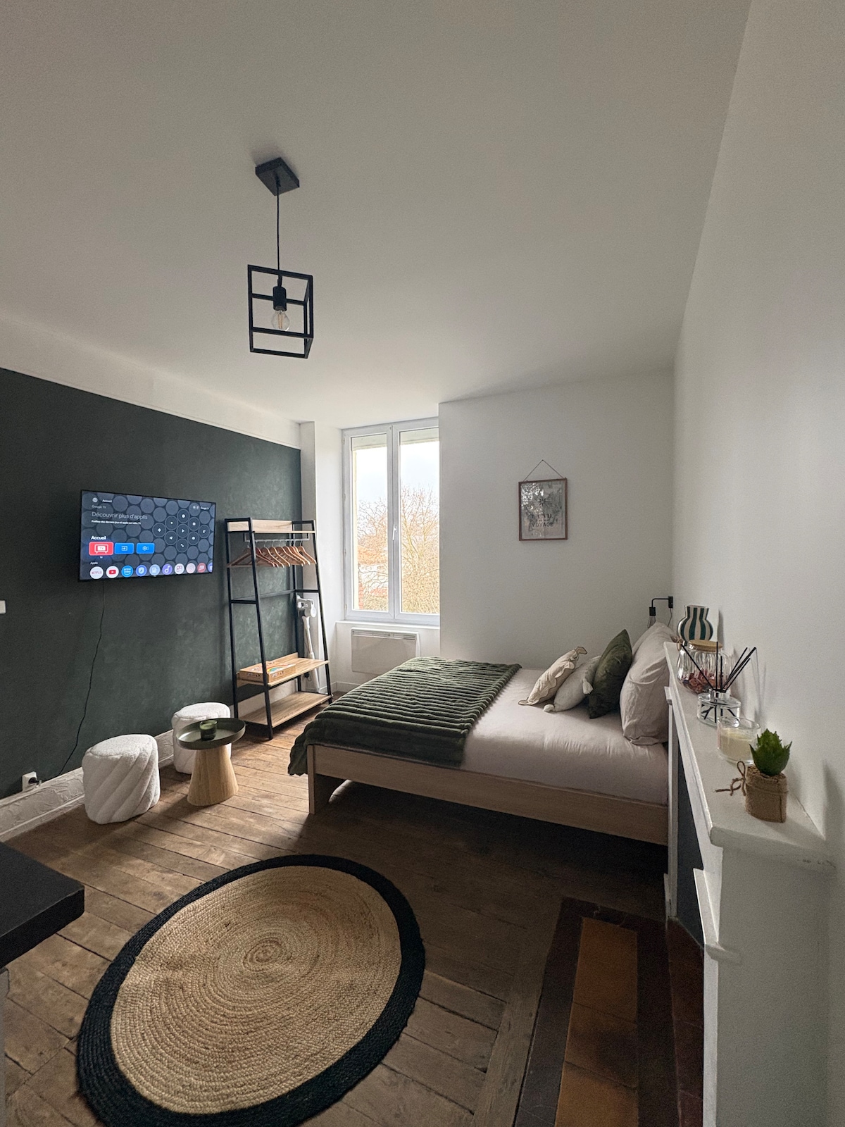 Refait entièrement à neuf pour mieux vous accueillir. Vous y trouverez un lit king size en 160/200 avec son sur matelas bambou naturel. Serviettes de bains non fournies. Le linge de lit, les oreillers, la couette, papier toilette et savon seront fournis . Tout le nécessaire y'est : micro ondes, machine à café, frigo, tv full hd, vaisselle, ustensiles de cuisine. L'appartement se trouve à 10mn à pied du futuroscope, et dispose d'1 place parking gratuit. Location non fumeur et sans internet.
