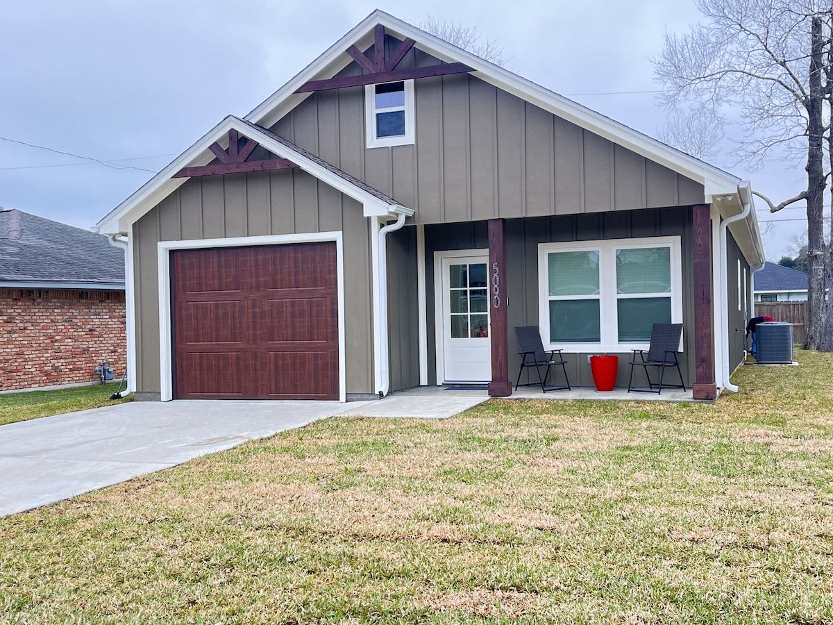 Whether you are visiting Orange for work or play, the Bayou Bungalow is the perfect place to stay! This brand new cabin has 1 bedroom with a queen size Casper bed, plus a full size sofa bed in the living room. You'll find a huge walk in shower in the bathroom. The kitchen has full size stainless steel appliances as well as pots, dishes, coffee maker, etc. all the comforts of home! It even has a washer and dryer! New mini splits and tankless water heater keep you comfy during your visit.