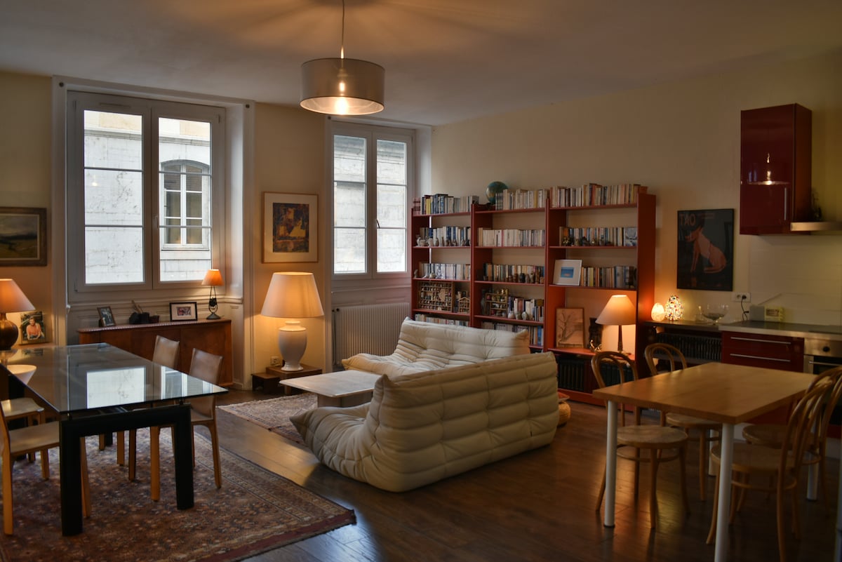 Charmant appartement typiquement bisontin sur cour intérieure avec escalier double ! -Situé en plein centre ville, proche de la mairie, son accès se fait par une cour intérieure typique de l'architecture de la ville. - Living très lumineux avec un espace salon/salle à manger, cuisine ouverte entièrement équipée! -3 chambres en enfilades communicantes avec salle de bain au centre (et douche + baignoire). - accès à un petit jardin partagé. - Parkings très proche (mairie) -Wifi (pas de tv)