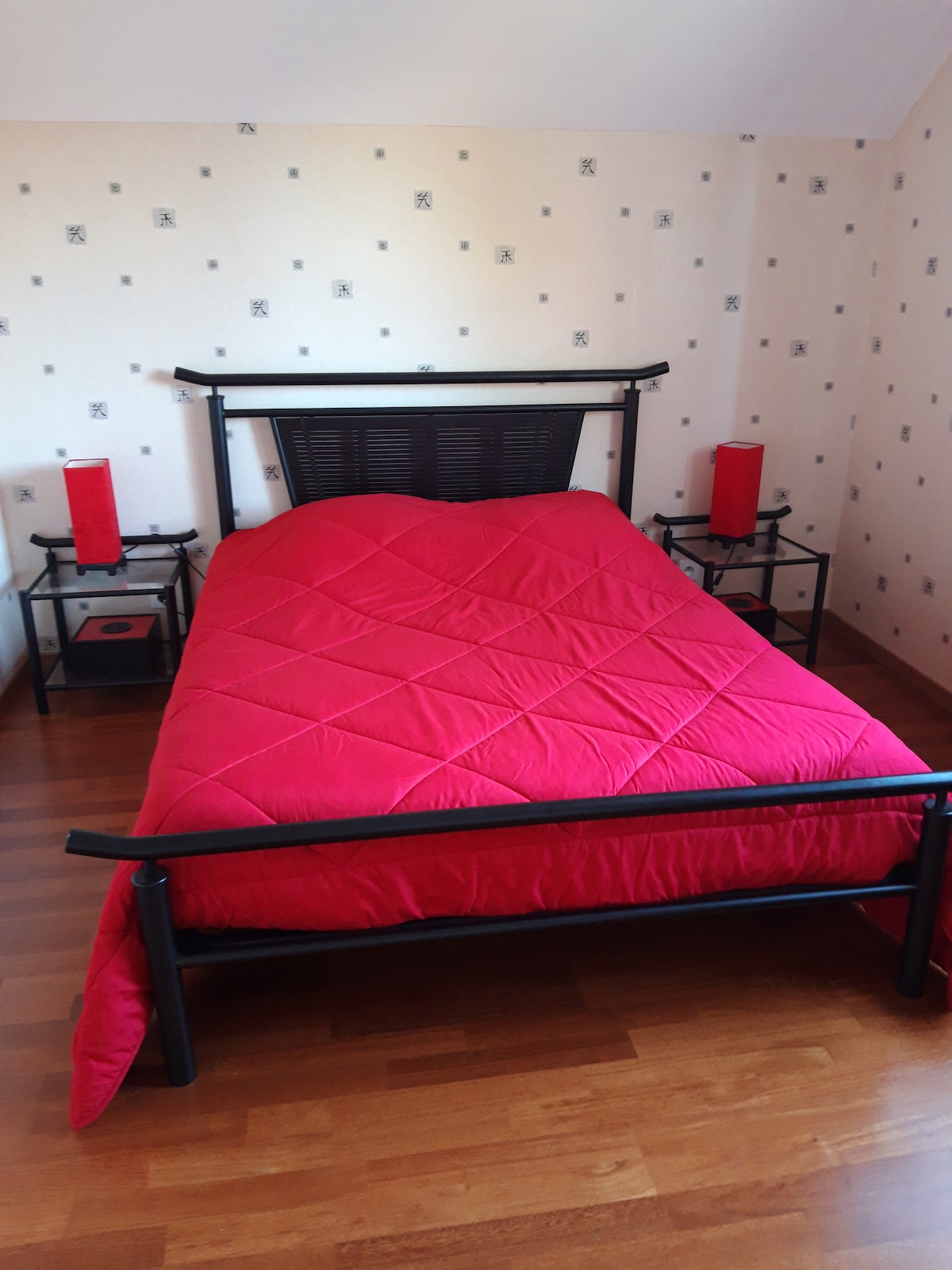 Chambre calme équipée d'un lit double 140/200 avec wc , lavabo et douche italienne , une commode ,une télévision , des draps et des serviettes de bain. Un micro ondes, un frigidaire 100 litres Une bouilloire avec des sachets café soluble et sucres. 2 tasses ,2 assiettes,couverts et 2 verres