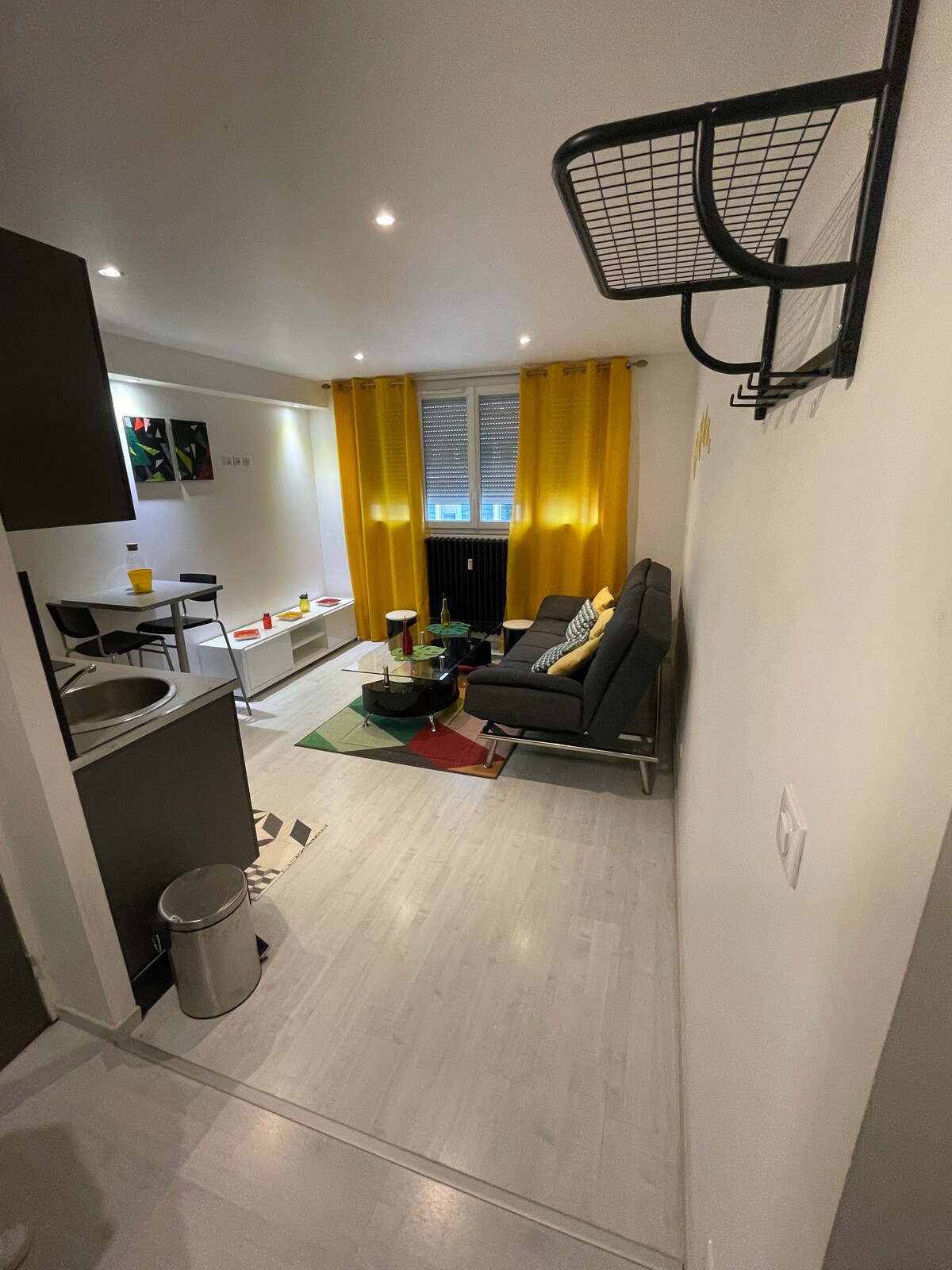 Ce studio (T1) élégant industriel de 33 mètre carrés est parfait pour les couples avec enfants, ou des ouvriers en déplacement professionnel, pas plus de 2 adultes, et 2 enfants il se compose d'une chambre double et d'un canapé lit, possible de mettre chaise haute et lit de bébé