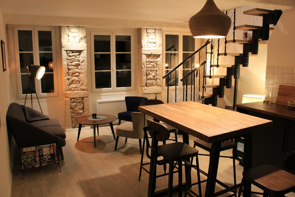 Ce loft climatisé est unique, il est situé en plein coeur du centre historique tout en étant au calme au fond d'une cour à proximité immédiate des Hospices. Il possède une vue incroyable sur la place Carnot et même sur le clocher des Hospices. Nous l'avons entièrement rénové et décoré avec des matériaux nobles de qualité. Plafond cathédrale impressionnant de 6m de hauteur, très lumineux. Parking gratuit à proximité, restaurants et commerces sur la place. Tout équipé et arrivée 24/24