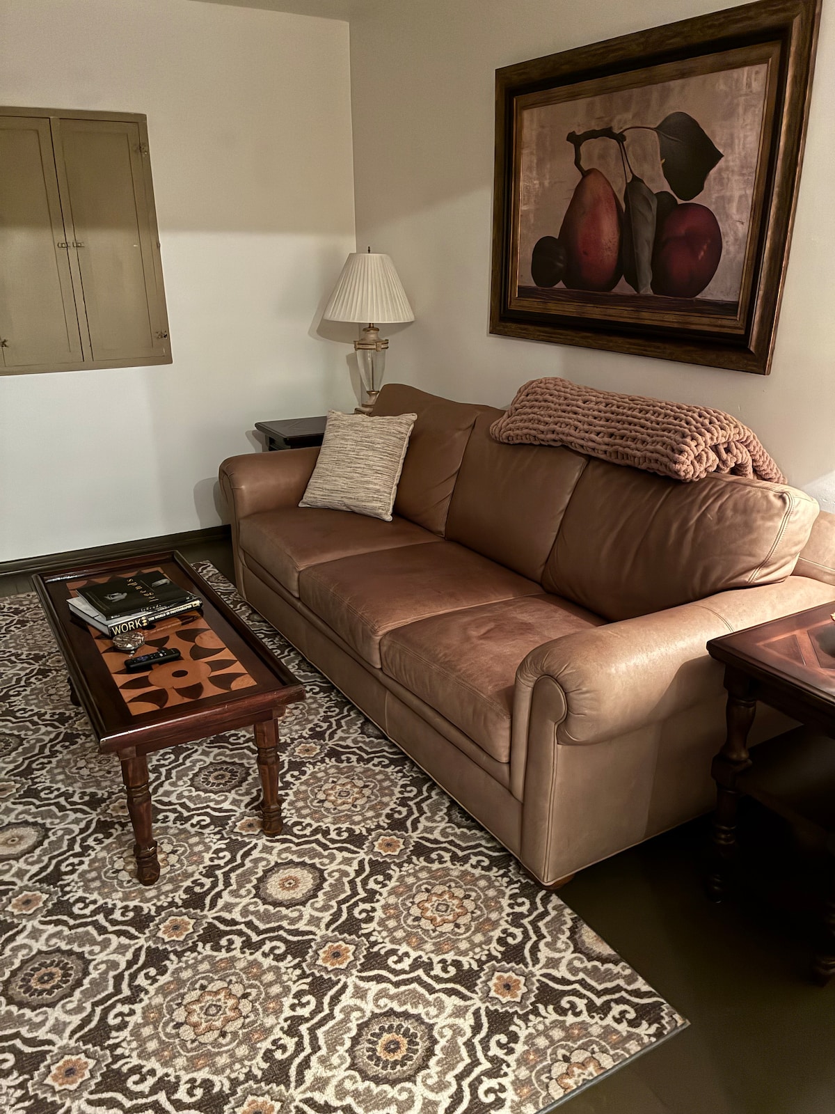 Relax in this stylish one-bedroom apartment featuring a 85” smart TV, full-size bed, high-speed WiFi, and a fully equipped kitchen with stove, stainless steel fridge, microwave, and coffee maker. Unwind with Bluetooth speakers in the bathroom and enjoy all the comforts of home during your stay.