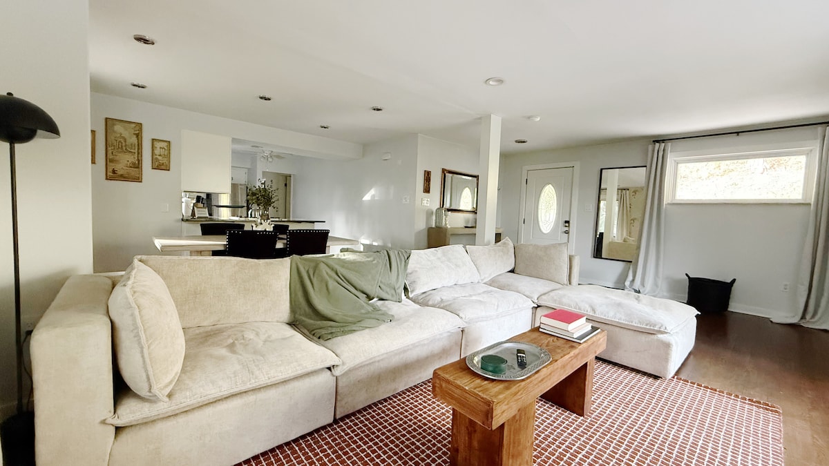 Bring the whole family to this recently renovated home. This three story space has a layout perfect for group travel with friends or family. Our king-size bedroom and office are on their own floor, creating privacy for the second and third bedrooms are located on the top level. This stay is located on a quiet neighborhood street with off-street parking available, and a small park within walking distance — perfect for kids! We hope you book The Modern Industrial Farmhouse for your next getaway!