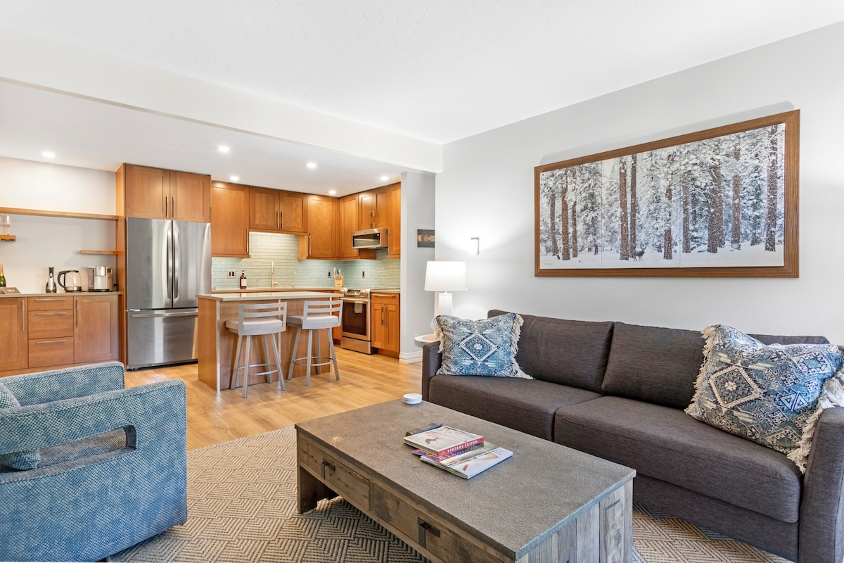 Modern two-bedroom, two-bath condo on the Eagle River at the base of Beaver Creek and just 15 minutes from Vail! Complete with a fully stocked kitchen, luxury mid-century modern furnishings, smart TV with cable, board games, and curated touches to make you feel at home. Tucked in a peaceful, tree-lined setting along the river, yet just a 5-minute walk to the free Beaver Creek shuttle, bus stops with service to Vail and Edwards, and the picturesque Eagle Valley Trail.