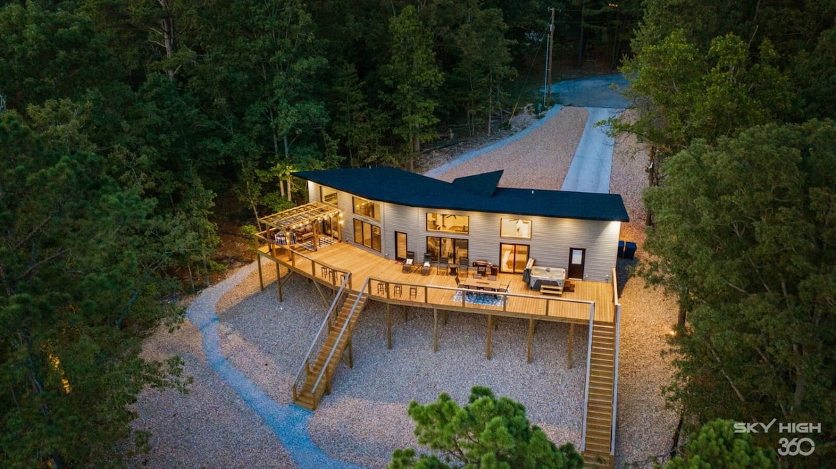 Escape to a brand-new, 2-story treehouse near Beaver Lake! Enjoy nature views from the deck with a recessed stock tank hot tub, stay cozy with an electric fireplace, and cook in the fully stocked kitchen. This unique retreat offers 2 bedrooms (one is a loft accessed by ladder), 3 beds, and sleeps 5. With fast WiFi and a mini-split HVAC system for room-specific climate control, you'll feel secluded yet close to Rogers' attractions. Perfect for a peaceful, modern getaway!