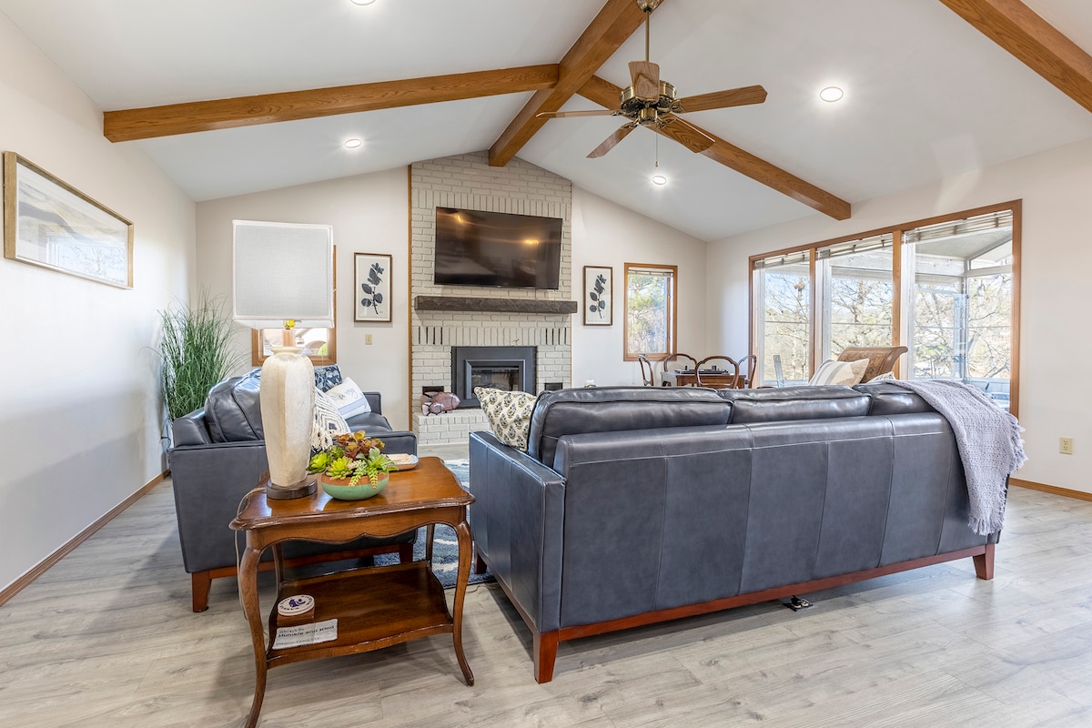 This beautiful 3 bed 2 bath, 2120 sq. ft. home has stunning views of Beaver Lake from the picture windows and beautiful full deck patio. Open style kitchen, living, and dining make entertaining a breeze. Master has ensuite and a queen size bed, second bedroom has a queen size bed, third bedroom has twin/full bunk beds and an additional full size bed, fireplace. Sun room has desk and bistro table. Downtown Rogers is only about 10 mins away. Home features 3 TVs, WIFI, and Blu Ray Player.