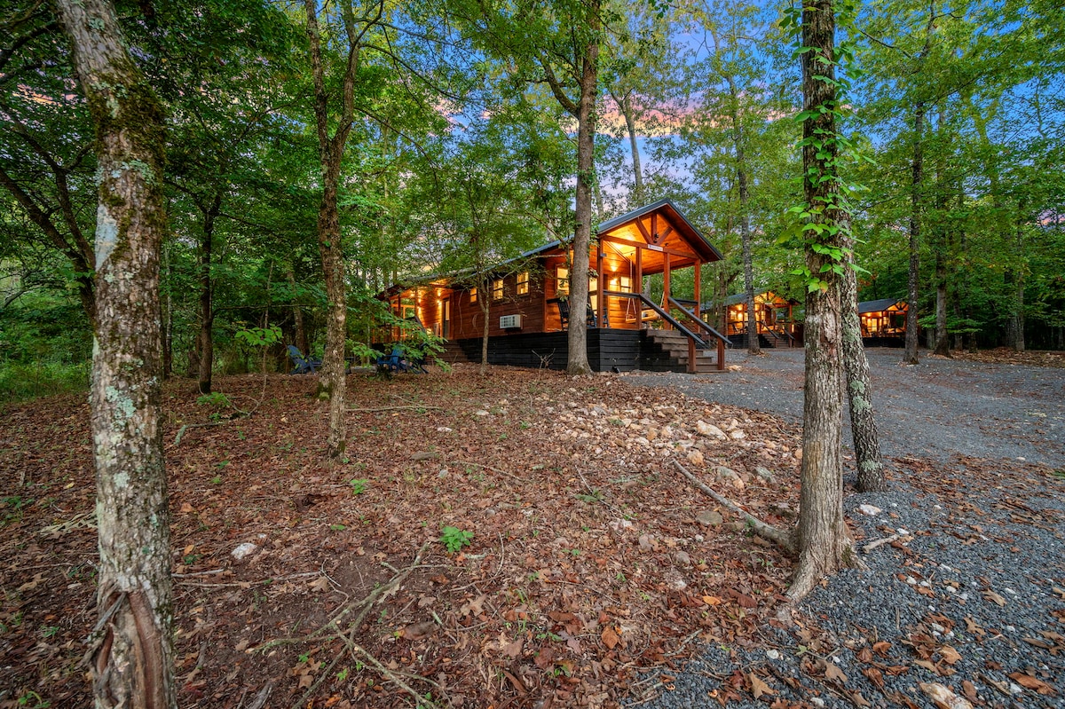 * Hot Tub * Swinging Daybed * Fire Pit * Swing Garden * Treetop Deck * EV Charger Escape to a modern romantic cabin near Beavers Bend State Park and Broken Bow Lake. This secluded gem offers a serene retreat amidst lush woods. Relax on the elevated treetop-style patio, complete with a custom swinging daybed. Enjoy the swing garden next to the outdoor fire pit, where swinging egg chairs invite cozy evenings by the fire.