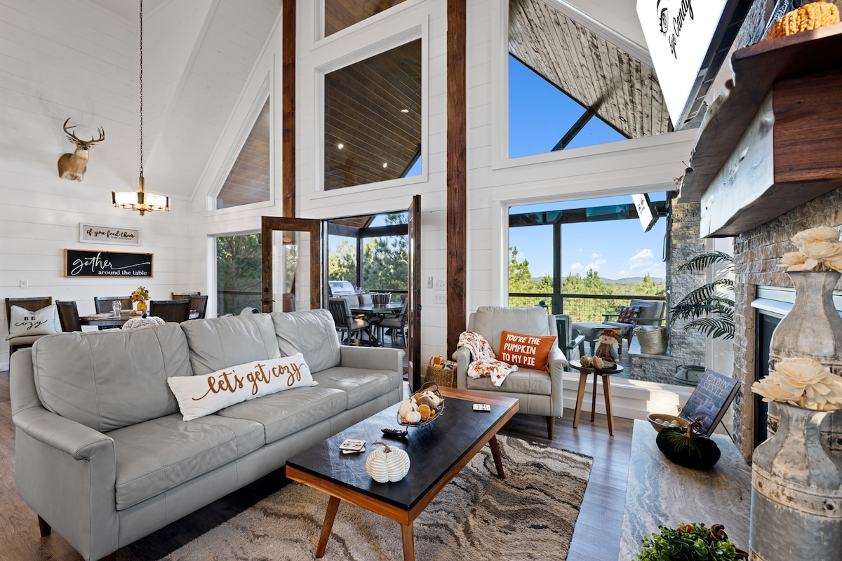 The Legend of Broken Bow by @TheVacayGetaway ⭐️New, luxury cabin on a wooded lot with expansive mtn views ⭐️TREX MURAL, life-sized dinosaurs, slide/rock climbing/arcade ⭐️Hot tub, putt putt, hammock chairs, cornhole, outdoor TVs ⭐️Two large decks with outdoor fireplace/dining/lounges ⭐️2 King ensuite bedrooms+twin over twin bunk bed landing ⭐️Gas grill/wood burning firepit ⭐️ROKU TVs in every room ⭐️Keurig/drip coffee 🚙 Pkg for 4, EV plug 📍 8 mi Hochatown 📍 9 mi Beaver's Bend