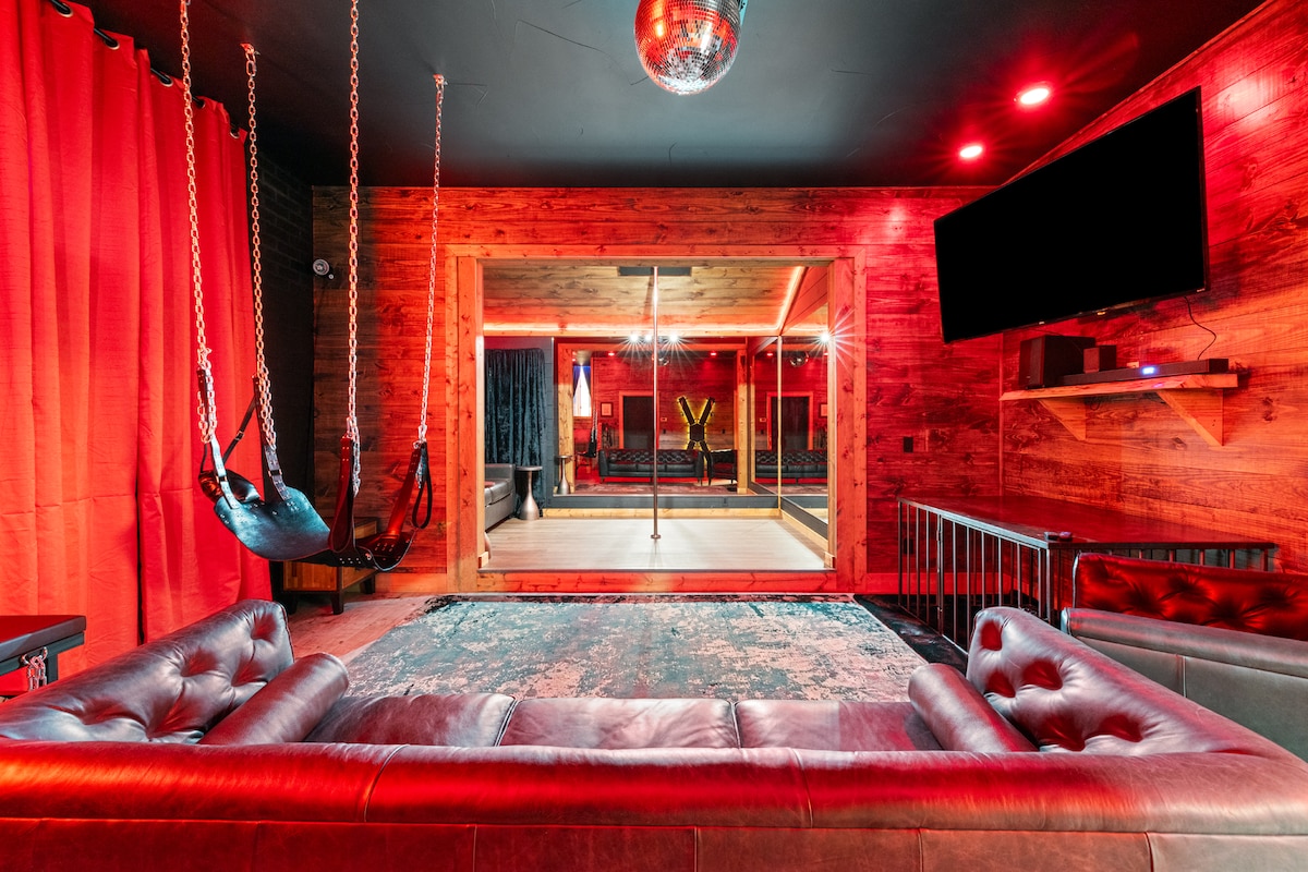 Welcome to Red Sunset, where all of your 50 Shades of Grey fantasies come true. This cabin is curated for consenting adults 25+ that are looking to explore their desires and indulge in activities that you only see in movies. This three story cabin features one king master bedroom with an ensuite bathroom and balcony. The kitchen and living room have a juke box, poker table, and wood burning fireplace. Downstairs, you will find a red room with a swing, cage, pole, and other spicy amenities! ;)