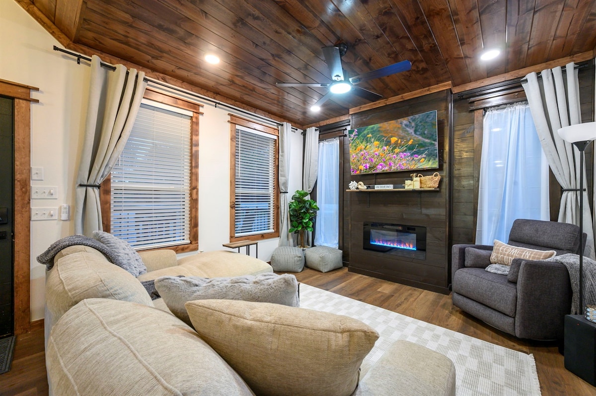 Modern Luxury Cabin | 2 King Suites • EV Charger • Pet-Friendly Discover The Modern—a stunning, design-forward cabin on 3.5 private acres in Broken Bow. Featuring soaring 18-ft ceilings, large windows, an all-white chef’s kitchen, wood stove, and 2 luxe king suites (one w/ soaker tub). Enjoy forest views, cozy up by the fire, and charge your EV onsite. Dog-friendly too! Book your unforgettable getaway today.