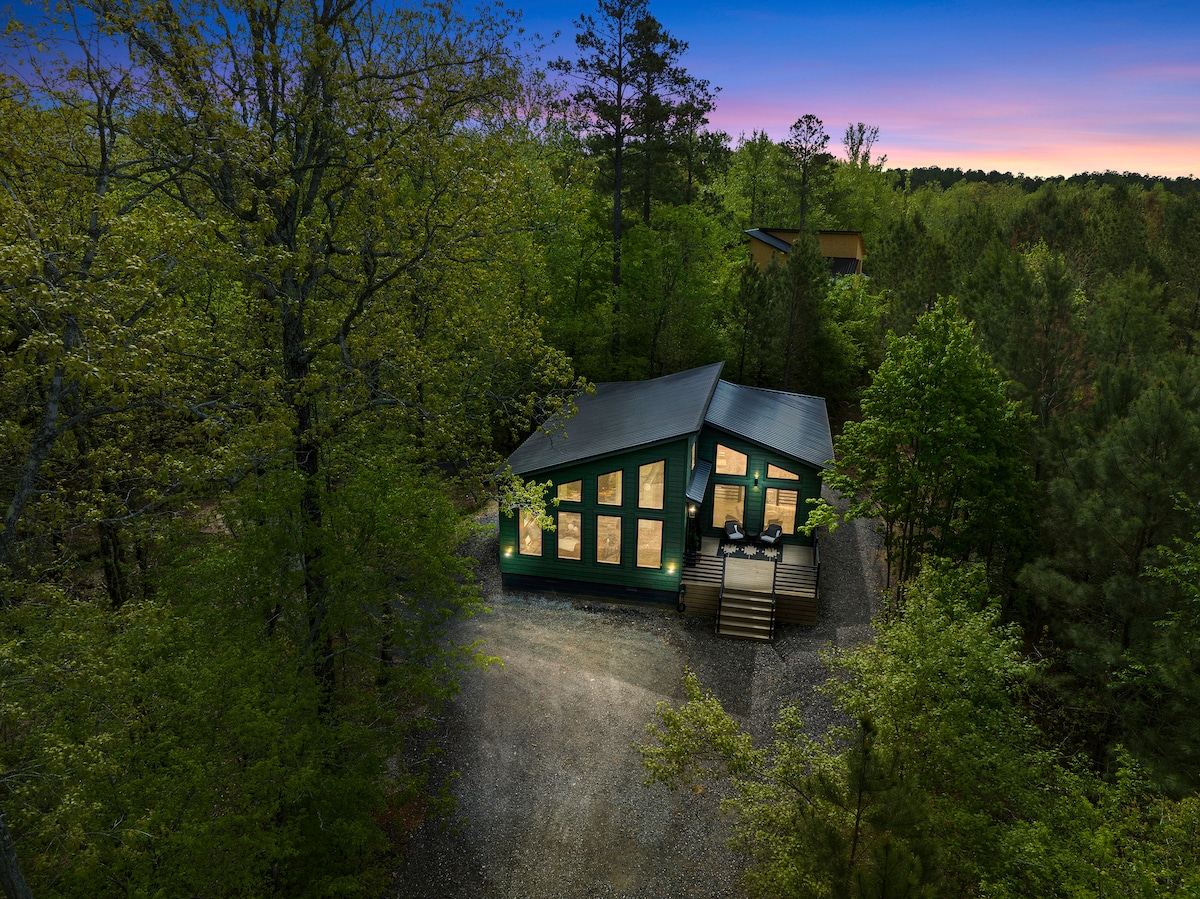 Introducing The Onyx Escape in Broken Bow Oklahoma! A true Honeymoon cabin experience. Discover the unparalleled serenity, nestled amidst the picturesque Ouachita National Forest. This spacious 1100 square ft. cabin boasts contemporary design and luxurious amenities to ensure your utmost relaxation and rejuvenation. The cabin showcases a vast outdoor living space surrounded by towering pine trees. Soak in the hot tub or cozy up by the fire while taking in the nature that surrounds you.
