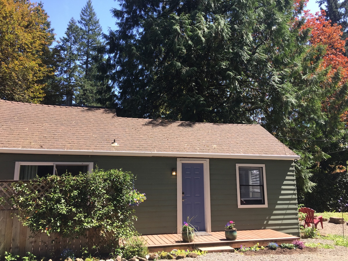 Sunny, private one bedroom cottage in quiet, wooded neighborhood. Separate dwelling behind main house. Queen bed, sofa bed, TV, WiFi, A/C, full kitchen, washer & dryer, bathroom with shower and beautiful patio. One mile from I-5 and 8 miles to downtown Portland. Short drive to downtown Lake Oswego. Walking distance, just two blocks, to La Provence, Jefe, Zupans, Albertsons, Starbucks, Waluga Park. Perfect for families or the business traveler. Come stay!