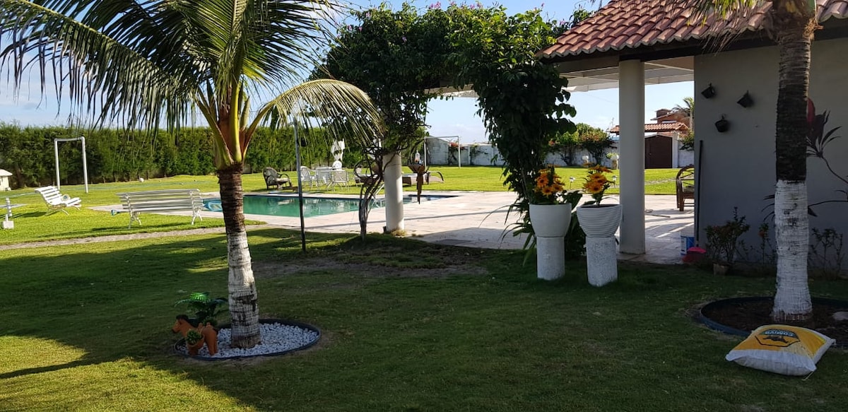 Come and enjoy an unforgettable vacation in our oasis just 300 m from the beach and near the famous Beberibe Cliffs in Ceará, Brazil. Spacious, recently renovated house with 7 bedrooms (6 are suites), all with air conditioning, double beds, and hooks for hammocks. 700 m² of built area, swimming pool, barbecue area, living and dining rooms, and fully equipped kitchen. Have fun in comfort, but please note: loud music, parties, and live bands are not allowed as this is a residential neighborhood.