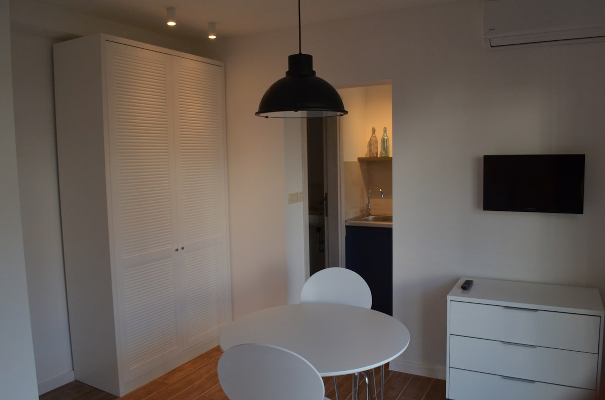 Welcome to our studio apartment with a stunning sea view! Perfect for solo travelers and couples. Looking to work from home? My studio's internet is fast enough for all the remote workers. The highlight of this studio is definitely the terrace. furnished with a lounge, sunbeds, and a hanging chair. Even on rainy days, you can enjoy it as the whole terrace is covered. There is no sofa inside the apartment as we believe it is more beautiful to sit outside and enjoy the views.