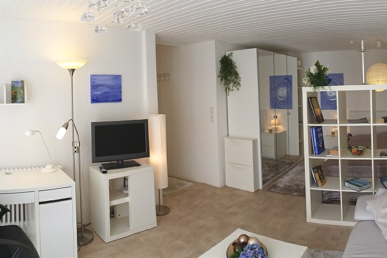 Das Appartement (52 m²) befindet sich in einem Mehrfamilienhaus auf der 1.Etage in der Kernstadt. Es verfügt über ein Wohnzimmer mit Doppelschlafsofa, Sat-Smart-TV, DVD Eßecke für 4 Personen, offener Schlafbereich (Vorhang) mit Doppelbett und Kleiderschrank. Die Küchenzeile ist komplett ausgestattet mit Mikrowelle, Backofen, Grill, Kühlschrank, Geschirrspüler, Wasserkocher, Espresso-, Kaffeemaschine, Toaster und Raclette. Großer Süd-West Balkon mit Sitzgelegenheit, Markise und Sichtschutz.